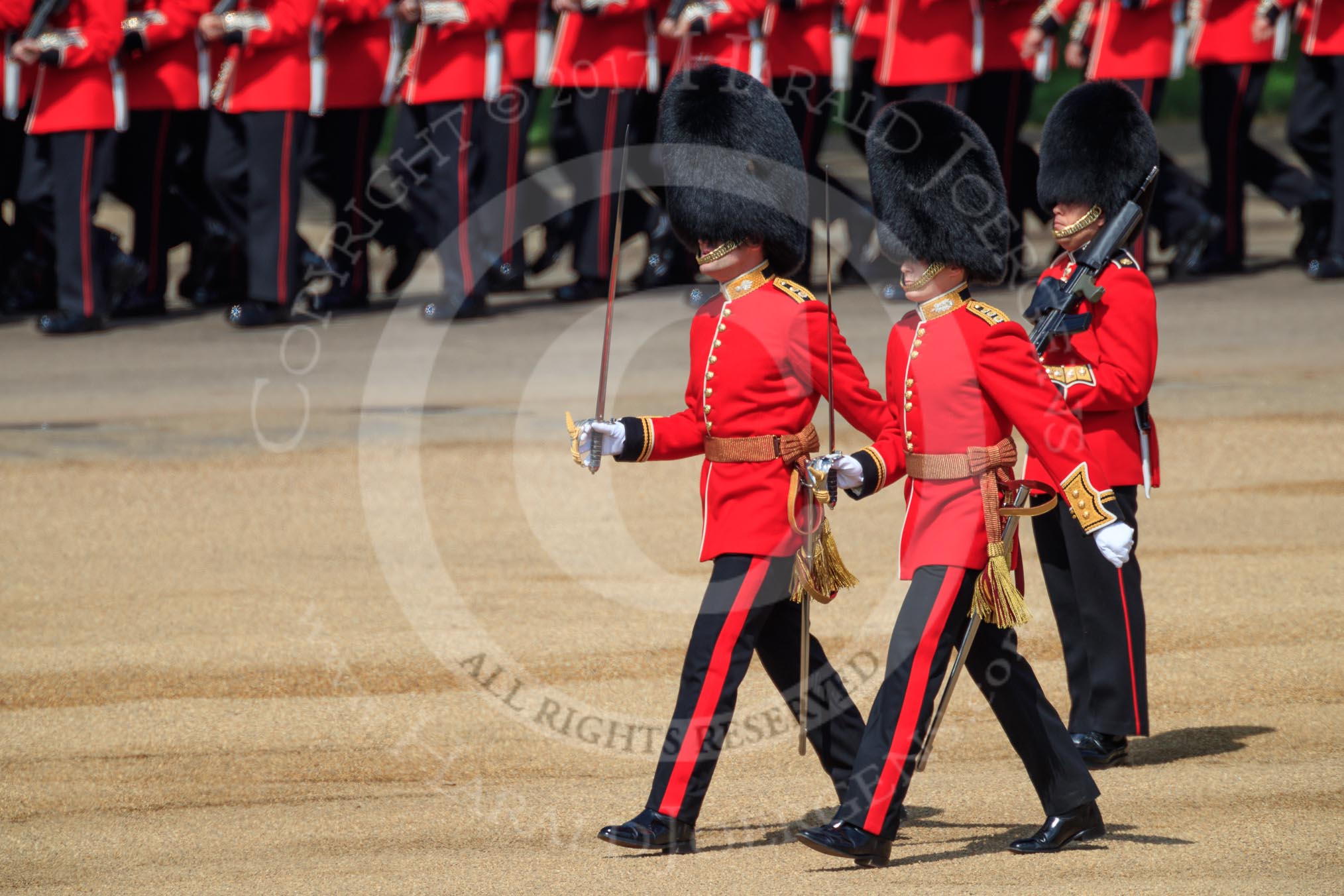 The Subaltern, Lieutenant Jake Sayers, Number Five Guard, Nijmegen Company, Grenadier Guards, and The Subaltern, Captain William Dalton Hall (27), Number Six Guard, F Company, Scots Guards, marching towards Horse Guards Arch during Trooping the Colour 2018, The Queen's Birthday Parade at Horse Guards Parade, Westminster, London, 9 June 2018, 10:30.