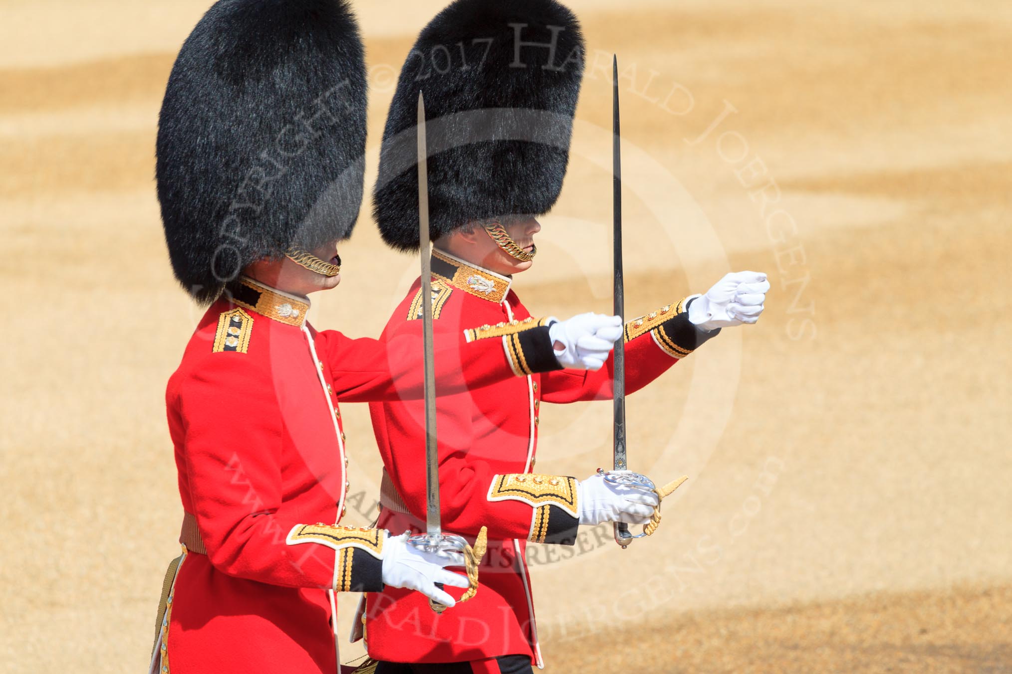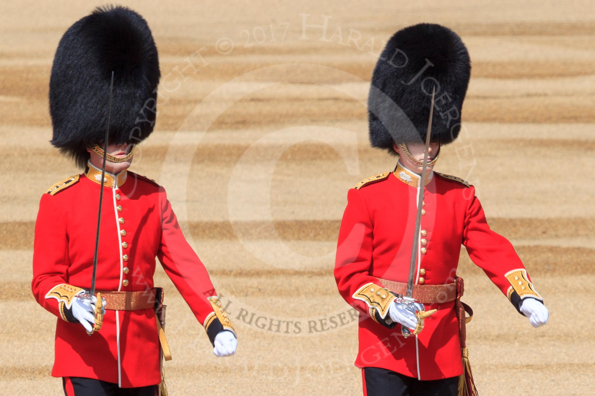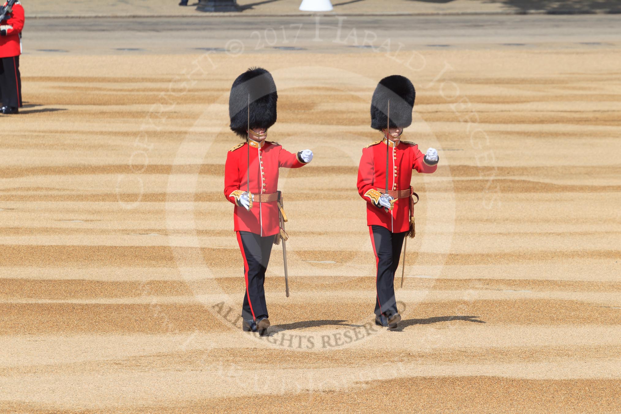 The Subaltern, Lieutenant Jake Sayers, Number Five Guard, Nijmegen Company, Grenadier Guards, and The Subaltern, Captain William Dalton Hall (27), Number Six Guard, F Company, Scots Guards, marching towards Horse Guards Arch during Trooping the Colour 2018, The Queen's Birthday Parade at Horse Guards Parade, Westminster, London, 9 June 2018, 10:29.