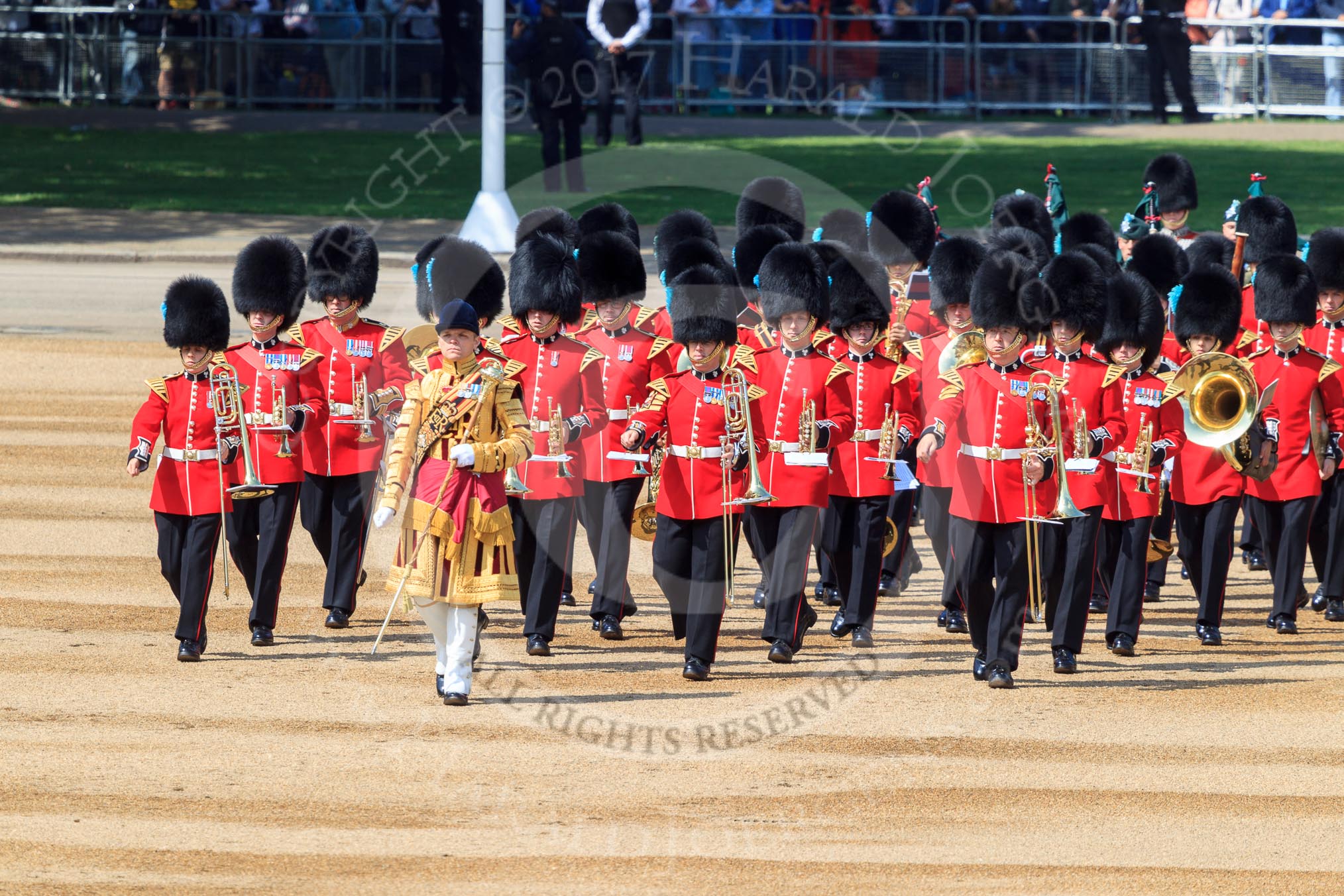 The Band of the Coldstream Guards marching onto Horse Guards Parade during Trooping the Colour 2018, The Queen's Birthday Parade at Horse Guards Parade, Westminster, London, 9 June 2018, 10:30.