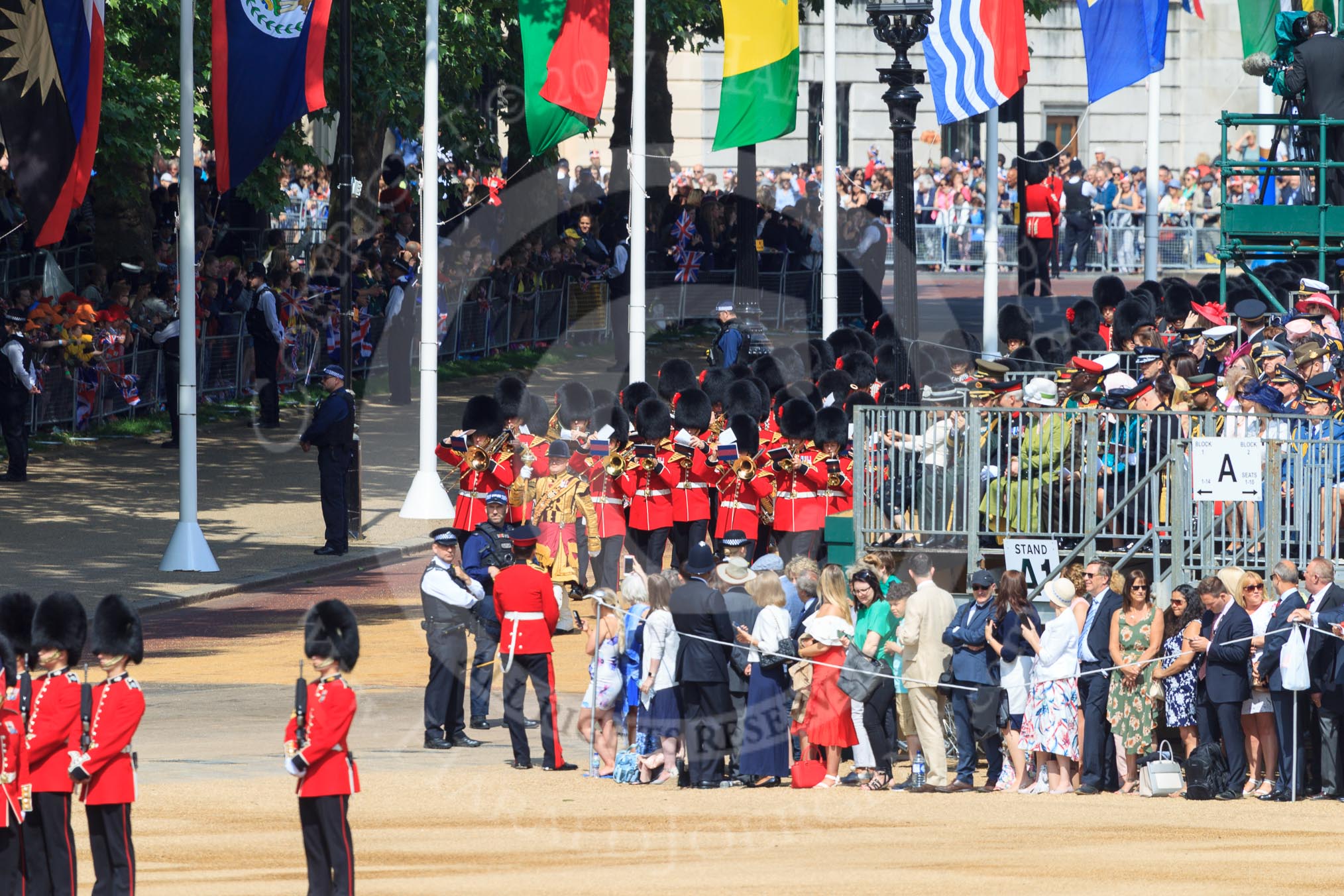 The Band of the Coldstream Guards marching behind Number Five Guard, Nijmegen Company, Grenadier Guards during Trooping the Colour 2018, The Queen's Birthday Parade at Horse Guards Parade, Westminster, London, 9 June 2018, 10:30.