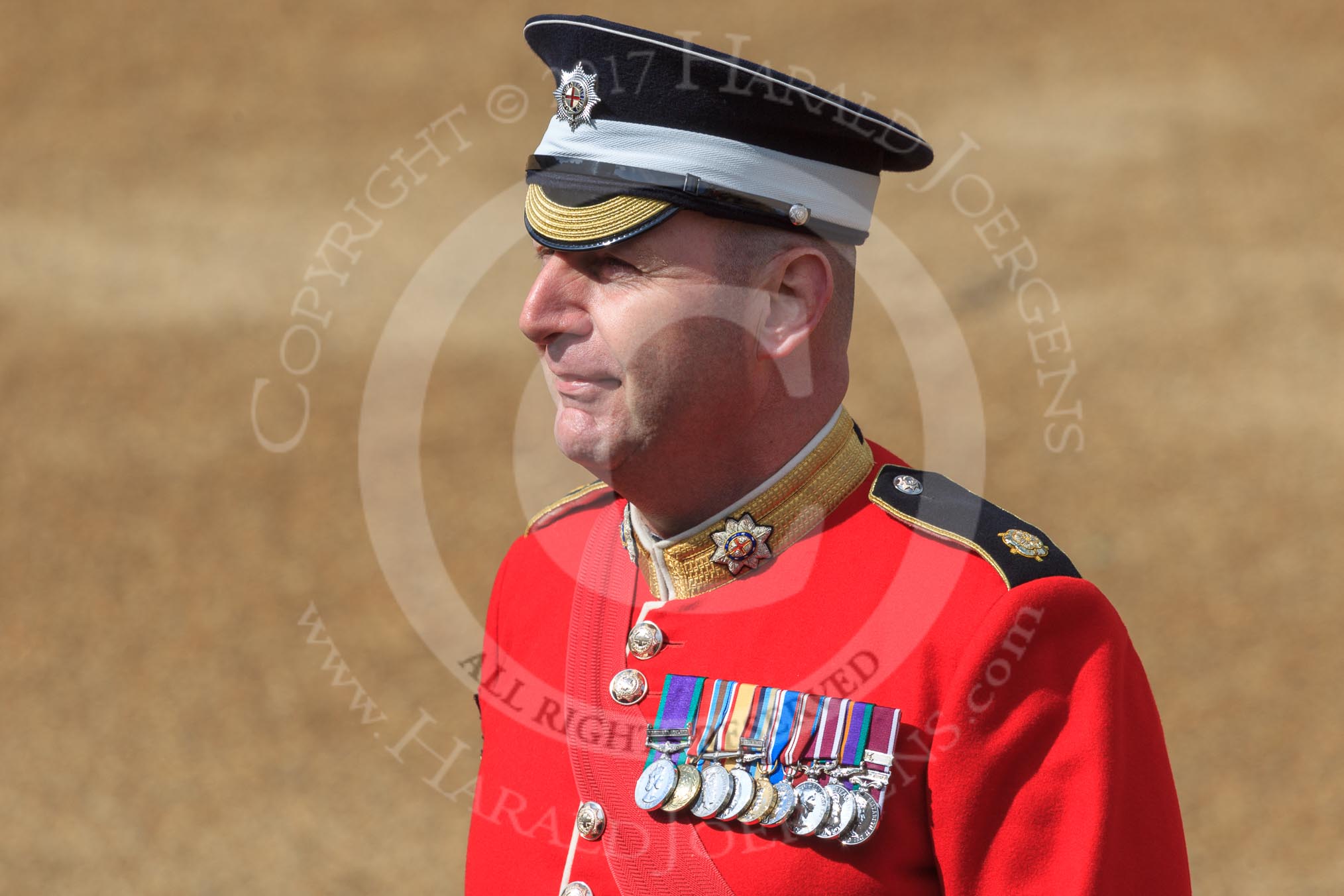 The Captain of the Escort to the Colour, Major JW Coleby, 1st Battalion Coldstream Guards, The Captain of the Guard, Major B Kemsley, Number Two Guard, 1st Battalion Coldstream Guards, and The Captain of the Guard, Major FGC Johnston, Number Three Guard, 1st Battalion Coldstream Guards, before Trooping the Colour 2018, The Queen's Birthday Parade at Horse Guards Parade, Westminster, London, 9 June 2018, 09:53.