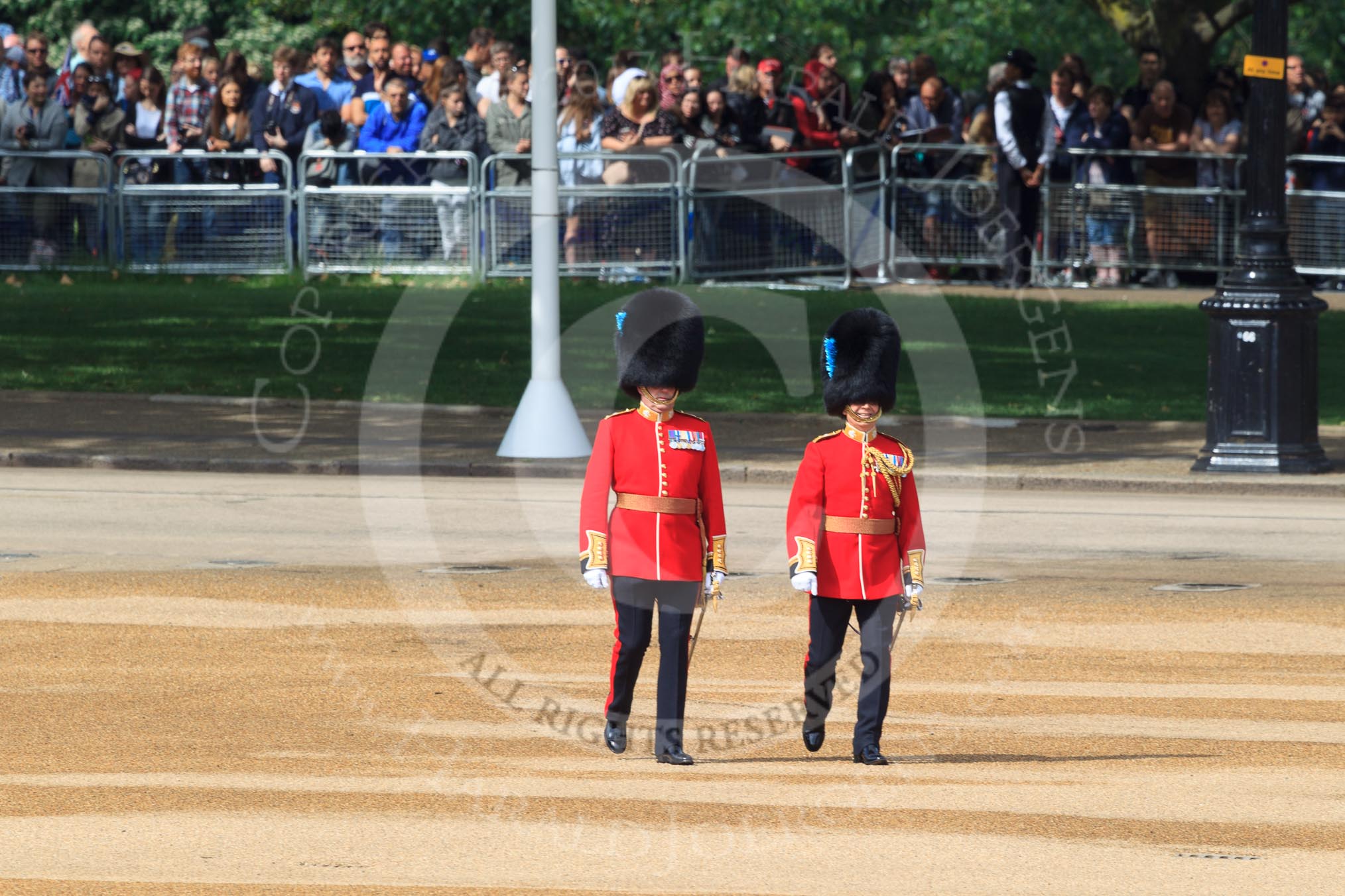 The Captain of the Guard, Major Tom F W Mortensen and The Ensign, Lieutenant Thomas Strachan (26) of Number Six Guard, F Company, Scots Guards marching to Horse Guards Parade before Trooping the Colour 2018, The Queen's Birthday Parade at Horse Guards Parade, Westminster, London, 9 June 2018, 09:54.