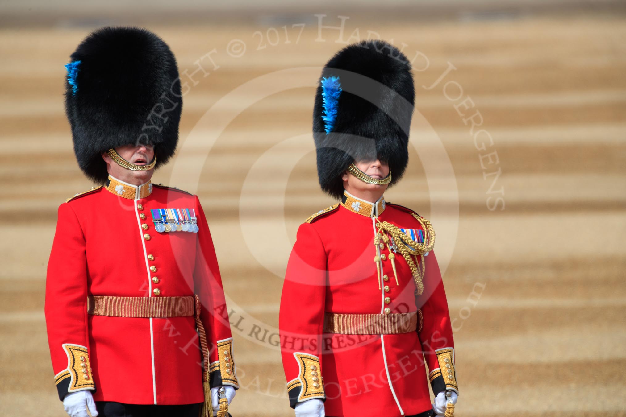 The Captain of the Guard, Major Tom F W Mortensen and The Ensign, Lieutenant Thomas Strachan (26), Number Six Guard, F Company, Scots Guards, before Trooping the Colour 2018, The Queen's Birthday Parade at Horse Guards Parade, Westminster, London, 9 June 2018, 09:54.