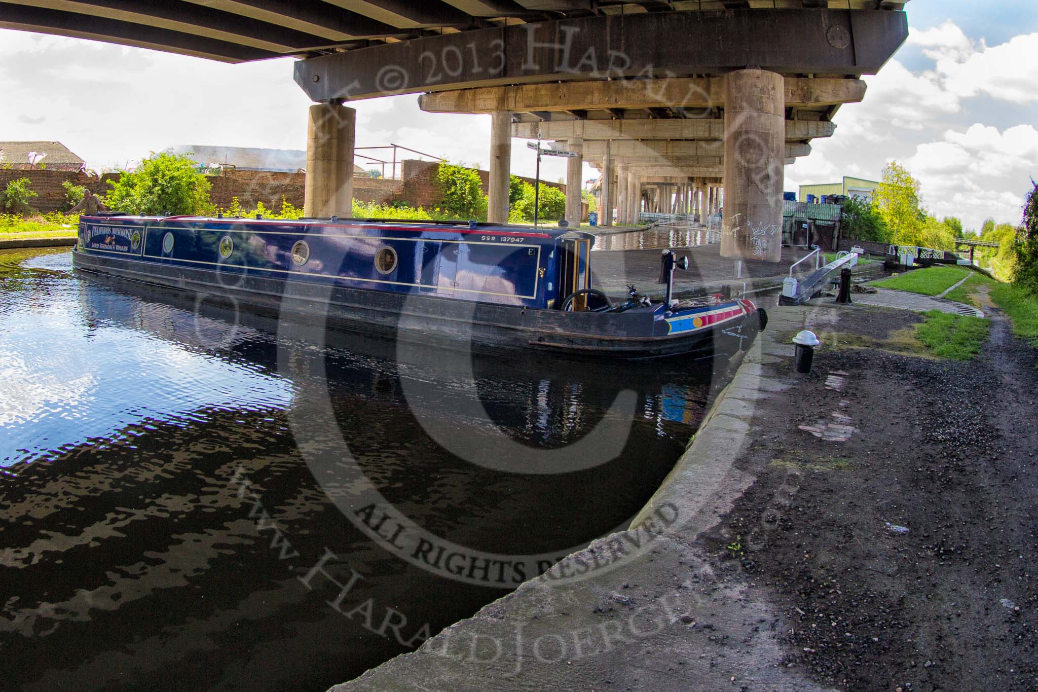 BCN Marathon Challenge 2013: NB "Felonious Mongoose" at Spon Lane Junction on the BCN Old Main Line, turning into Spon Lane Top Lock, leaving the M5 motorway behind, and heading down to the BCN New Main Line..