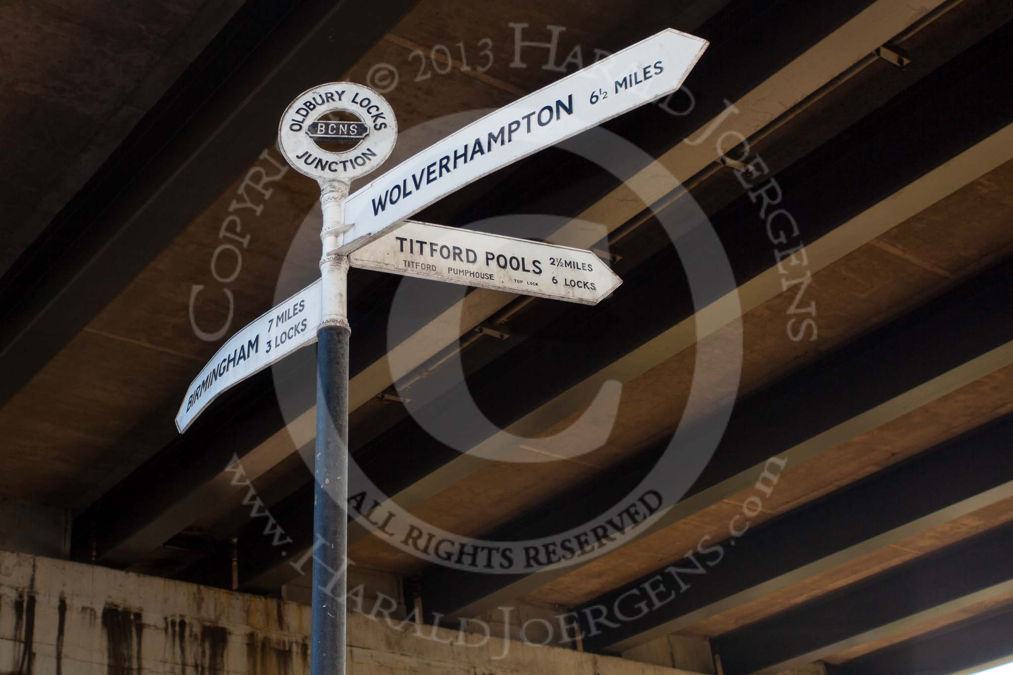 BCN Marathon Challenge 2013: The BCNS signpost at Oldbury Junction, under M5 motorway on the BCN Old Main Line. Birmingham is "7 miles and 3 locks" away, Wolverhampton 6 1/2 miles, and Titford Pools 2 1/2 miles and 6 locks.. Birmingham Canal Navigation, United Kingdom, on 25 May 2013 at 10:07, image #138