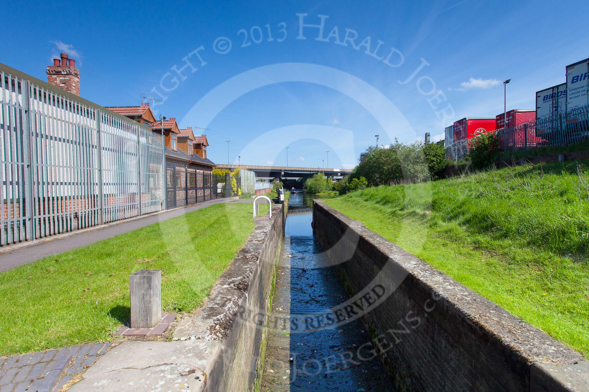 BCN Marathon Challenge 2013: The Titford Canal - view from Oldbury Bottom Lock towards Oldbury Junction with the BCN Old Main Line. On the right hand side of the basin belo the lock used to be a canal arm serving Springfield Chemical Works (Midland Tar Distillers).. Birmingham Canal Navigation, United Kingdom, on 25 May 2013 at 10:21, image #140