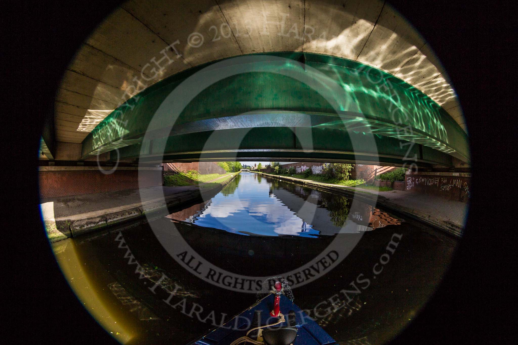 BCN Marathon Challenge 2013: Fish Eye view of Rabone Lane Bridge, BCN New Main Line. The modern bridge carries the B4136 over the canal.. Birmingham Canal Navigation, United Kingdom, on 25 May 2013 at 08:50, image #84
