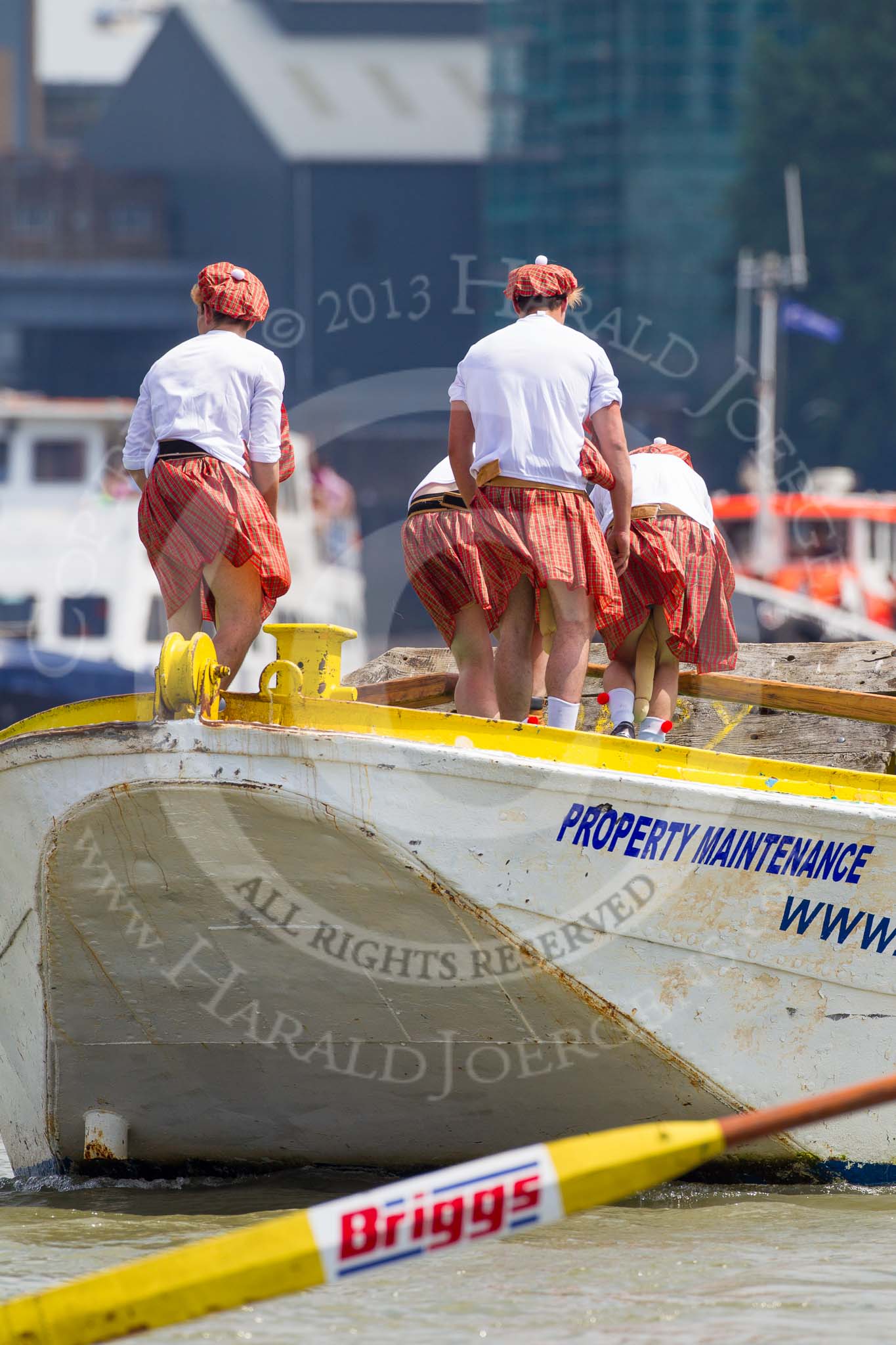 TOW River Thames Barge Driving Race 2013: Rowers wearing skirts on the deck of of barge "Hoppy" by GPS Fabrication..