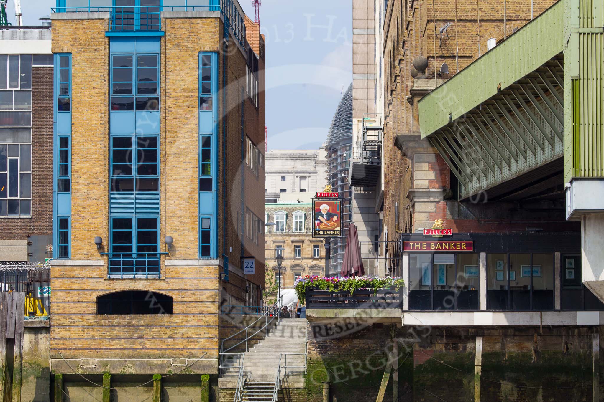 TOW River Thames Barge Driving Race 2013: "The Banker" pub in Cousin Lane, London EC4 seen from the river..