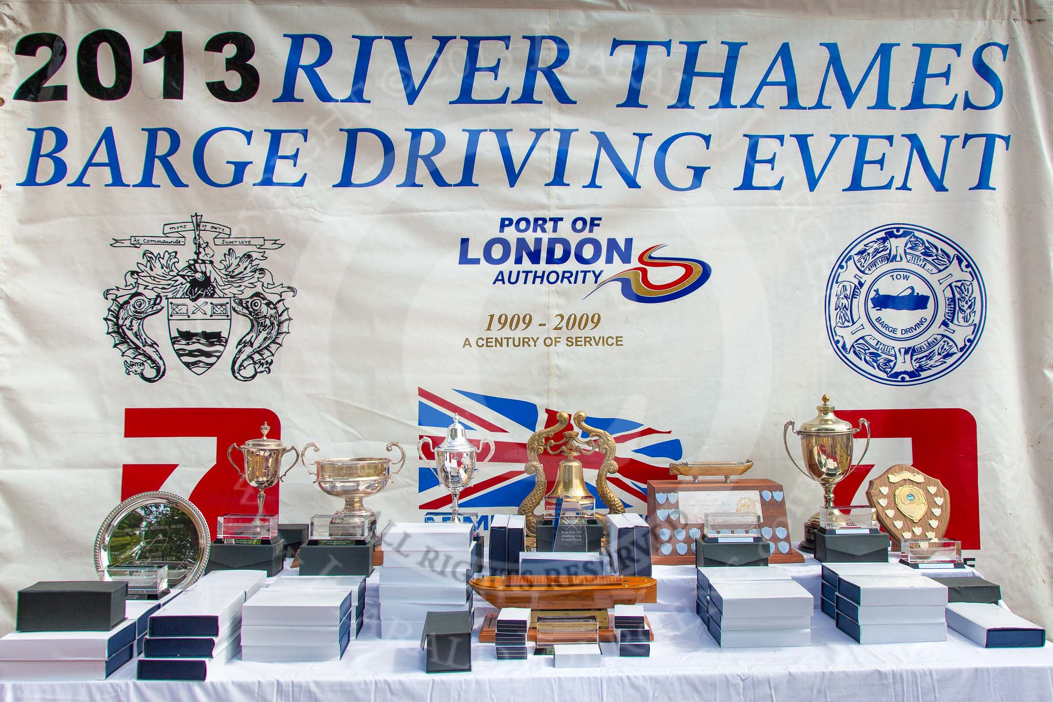TOW River Thames Barge Driving Race 2013: The prizes for the 2013 Thames Barge Driving Race on the presentation stage, before the price-giving..