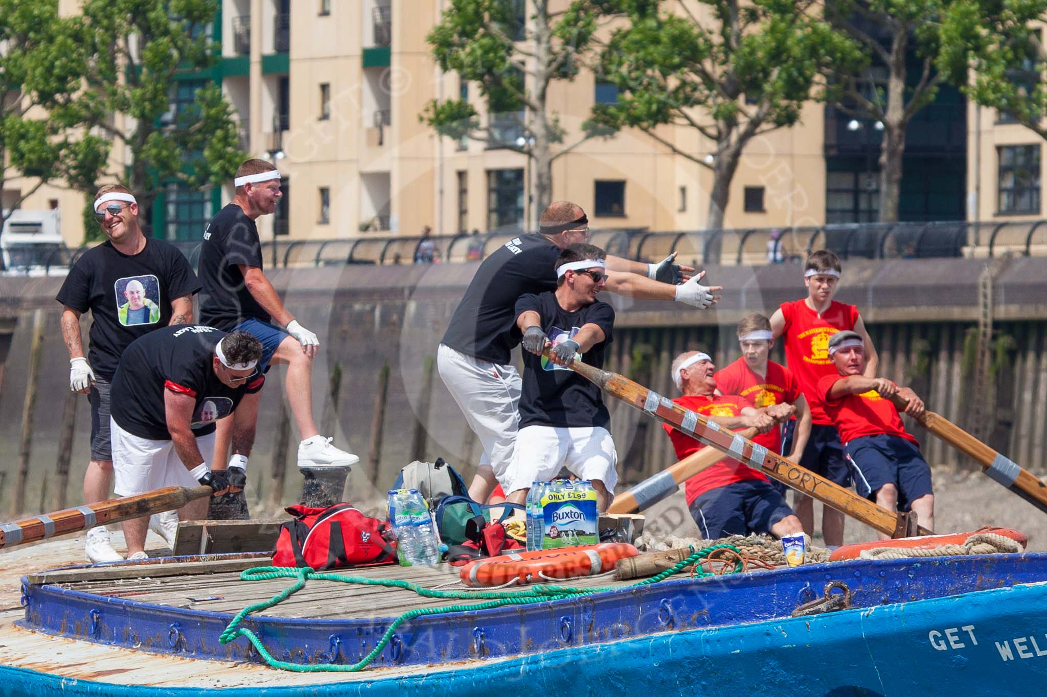 TOW River Thames Barge Driving Race 2013: Rowers on the deck of of barge "Spirit of Mountabatten", by Mechanical Movements and Enabling Services Ltd.. River Thames between Greenwich and Westminster, London, United Kingdom, on 13 July 2013 at 12:45, image #194