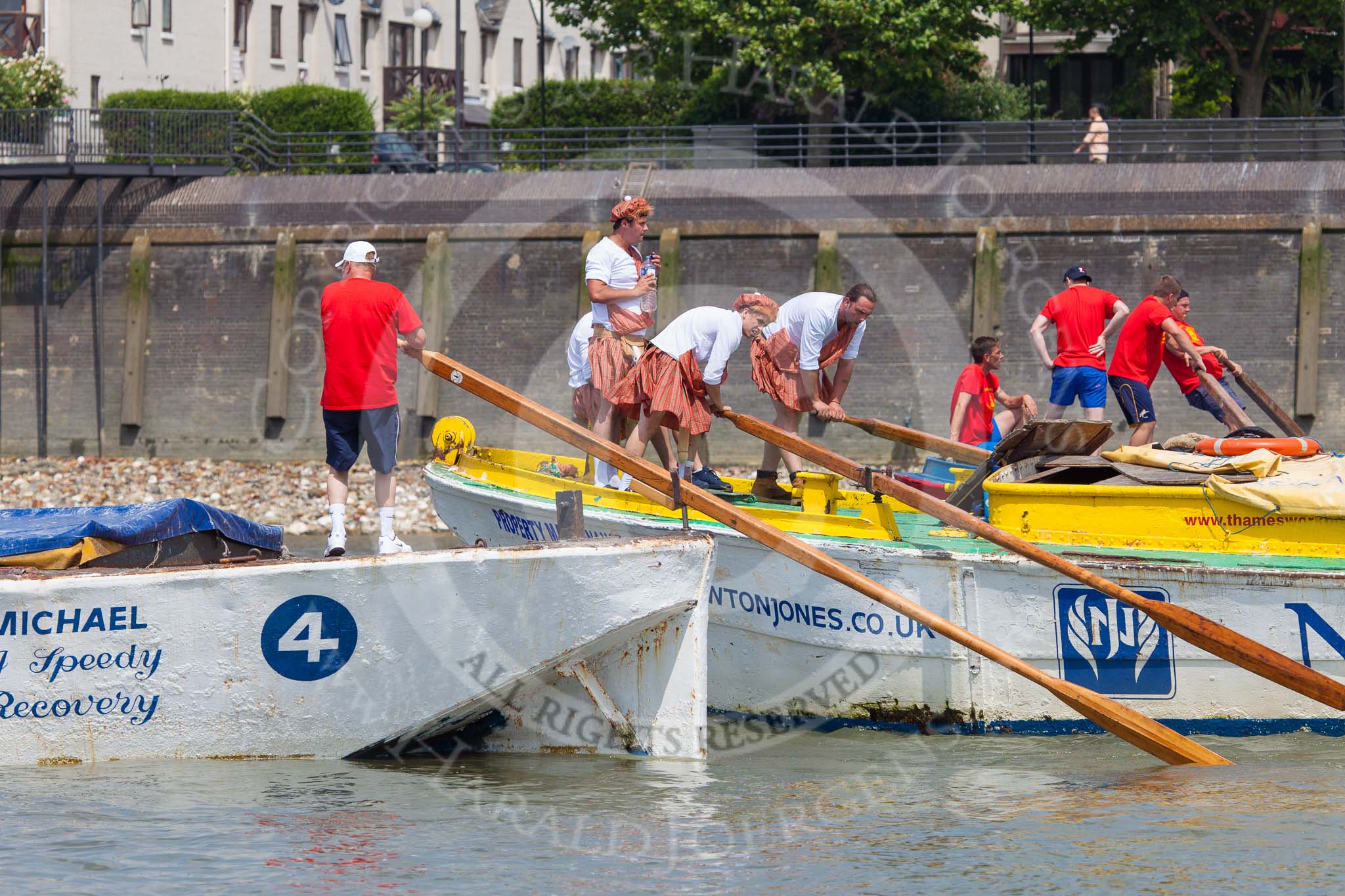 TOW River Thames Barge Driving Race 2013: Rowers wearing skirts on the deck of of barge "Hoppy" by GPS Fabrication.. River Thames between Greenwich and Westminster, London, United Kingdom, on 13 July 2013 at 12:44, image #191
