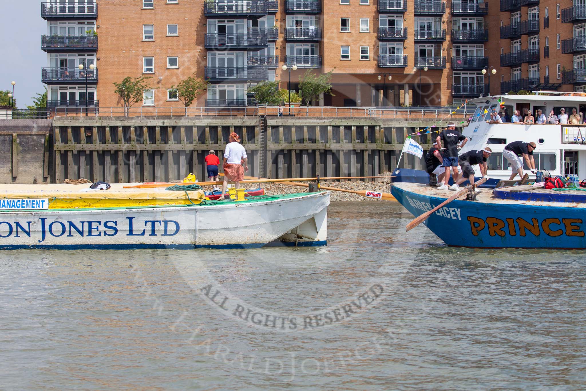 TOW River Thames Barge Driving Race 2013: Rowers on barge barge "Darren Lacey", by Princess Pocahontas, taunting rowers on barge "Spirit of Mountabatten", by Mechanical Movements and Enabling Services Ltd, on their right.. River Thames between Greenwich and Westminster, London, United Kingdom, on 13 July 2013 at 12:42, image #182