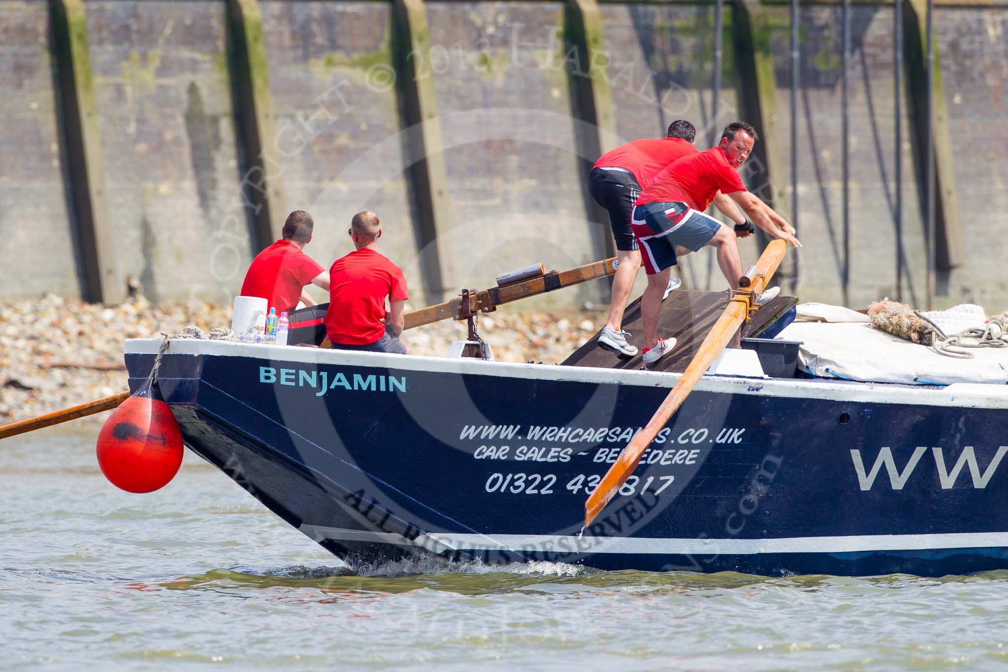 TOW River Thames Barge Driving Race 2013: Rowers working hard on board of barge "Benjamin", by London Party Boats.. River Thames between Greenwich and Westminster, London, United Kingdom, on 13 July 2013 at 12:47, image #214