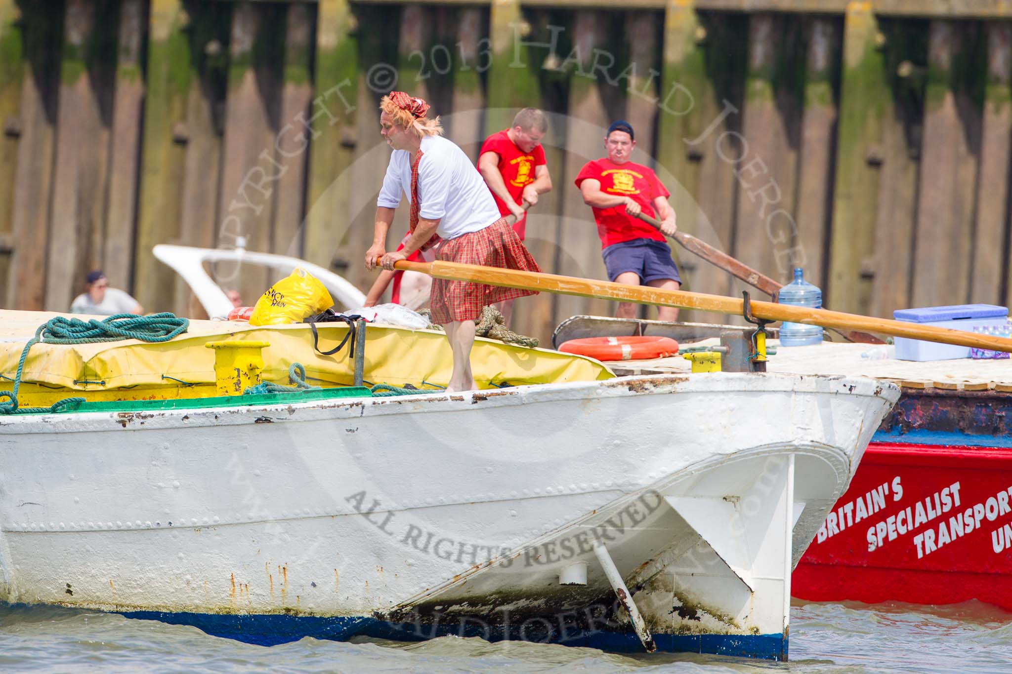 TOW River Thames Barge Driving Race 2013: rowers wearing skirts on the deck of of barge "Hoppy" by GPS Fabrication.. River Thames between Greenwich and Westminster, London, United Kingdom, on 13 July 2013 at 12:48, image #217