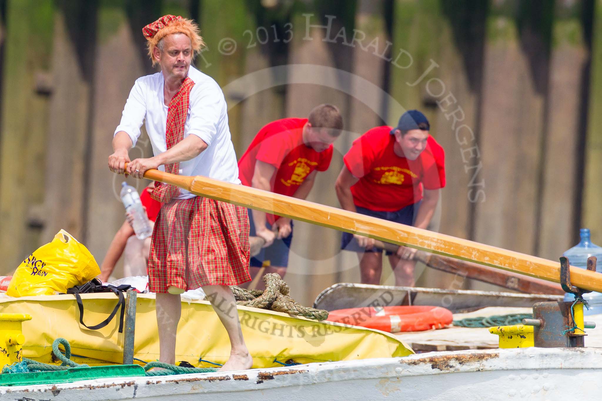 TOW River Thames Barge Driving Race 2013: The steerer of barge "Hoppy", by GPS Fabrication, behind Hoppy barge "Jane", by the RMT Union.. River Thames between Greenwich and Westminster, London, United Kingdom, on 13 July 2013 at 12:48, image #219