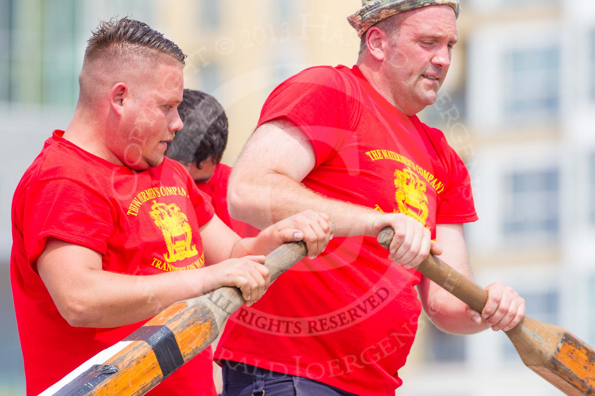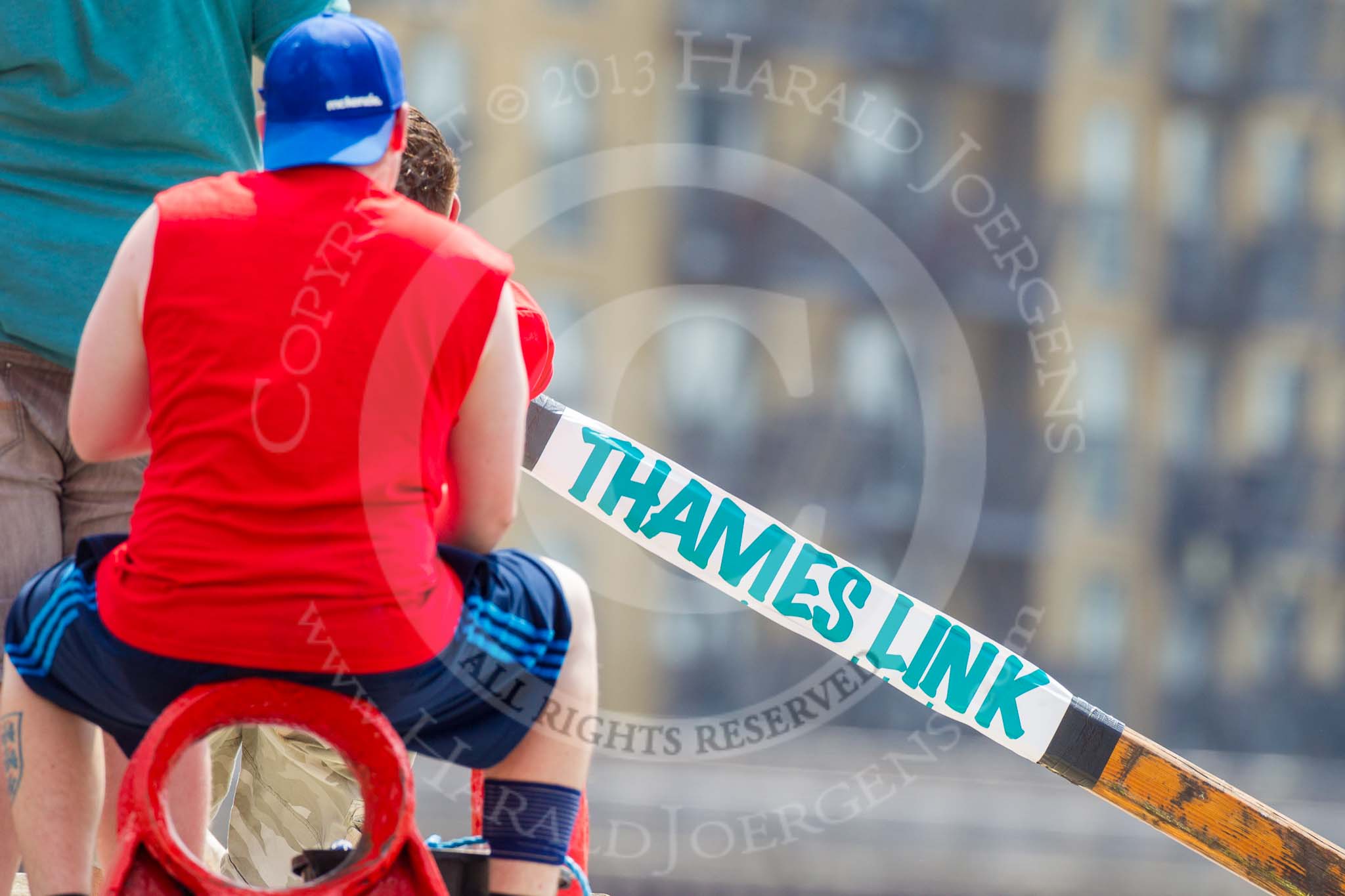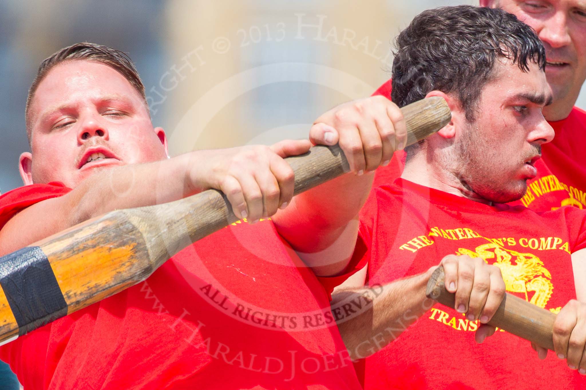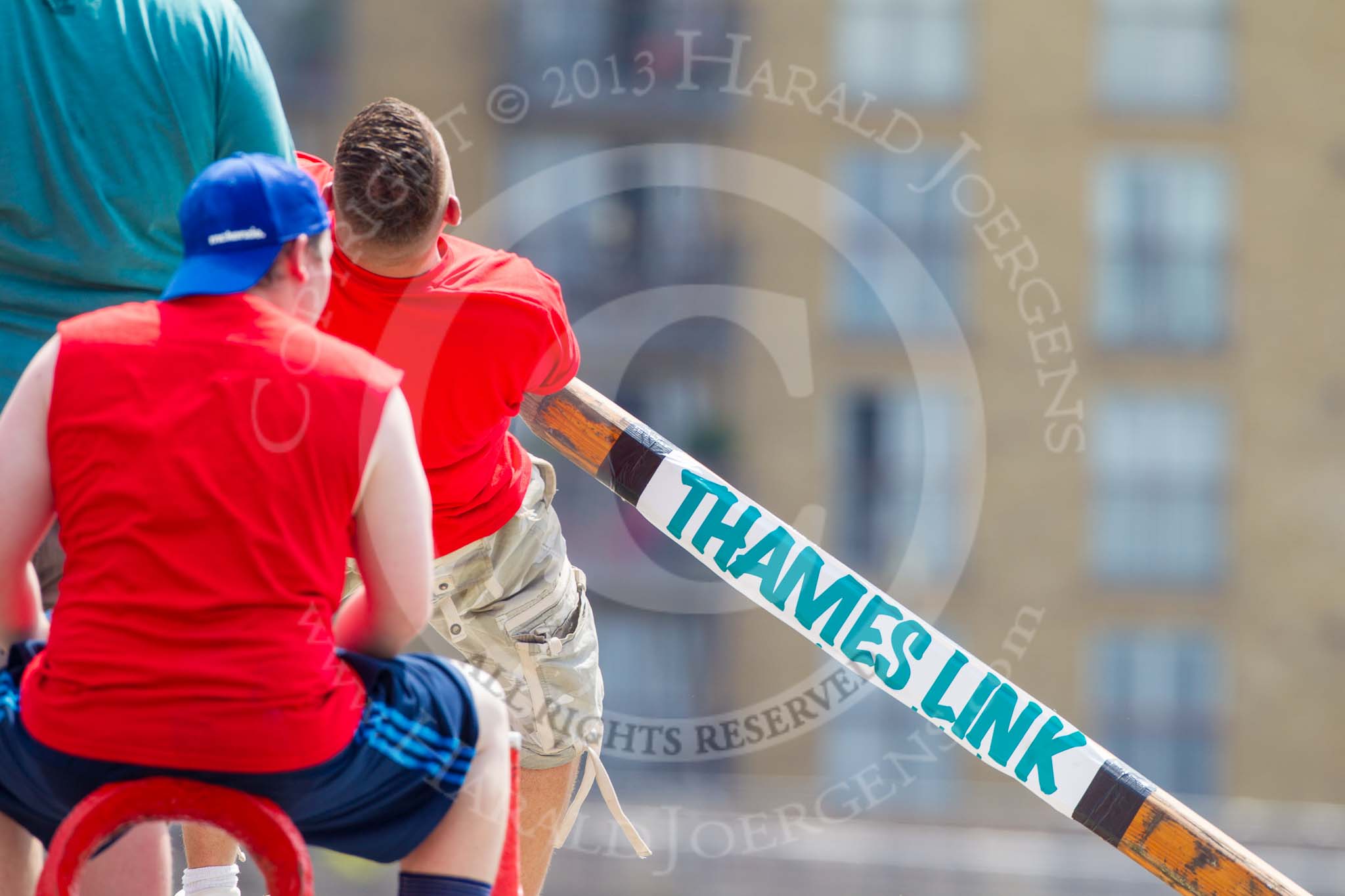 TOW River Thames Barge Driving Race 2013: Rowers on board of barge "Steve Faldo", by Capital Pleasure Boats.. River Thames between Greenwich and Westminster, London, United Kingdom, on 13 July 2013 at 13:01, image #260