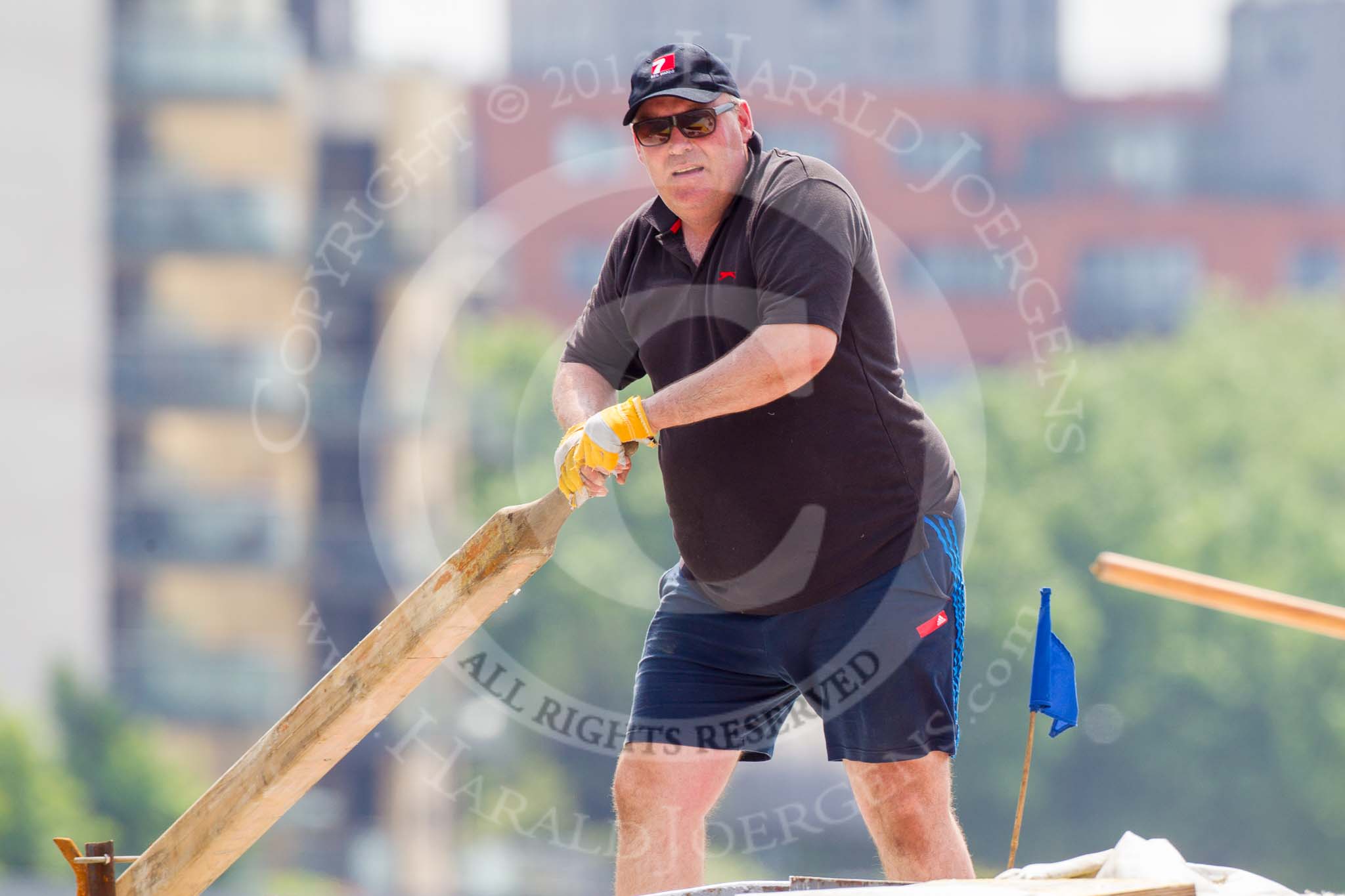 TOW River Thames Barge Driving Race 2013: The steerer on board of barge "Steve Faldo" by Capital Pleasure Boats.. River Thames between Greenwich and Westminster, London, United Kingdom, on 13 July 2013 at 13:01, image #259