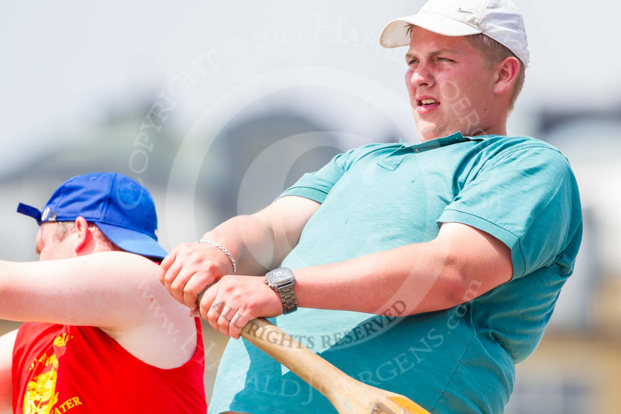 TOW River Thames Barge Driving Race 2013: Rowers on board of barge "Steve Faldo", by Capital Pleasure Boats.. River Thames between Greenwich and Westminster, London, United Kingdom, on 13 July 2013 at 13:00, image #257