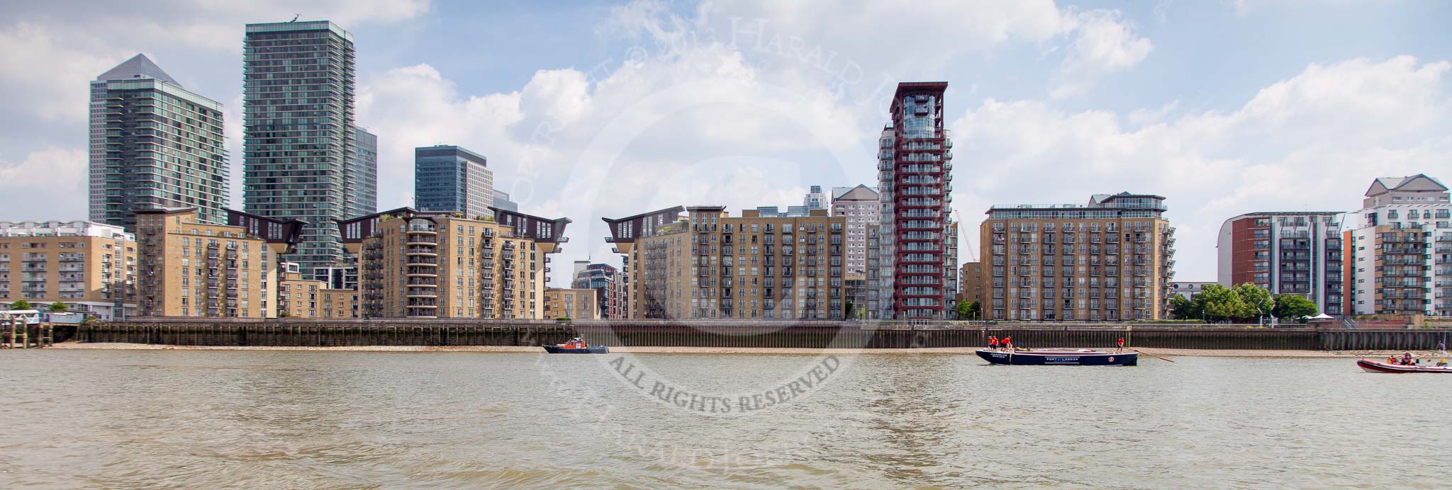 TOW River Thames Barge Driving Race 2013: Columbia Wharf and Hilton Docklands Riverside, London SE16, seen from the river.. River Thames between Greenwich and Westminster, London, United Kingdom, on 13 July 2013 at 13:11, image #284