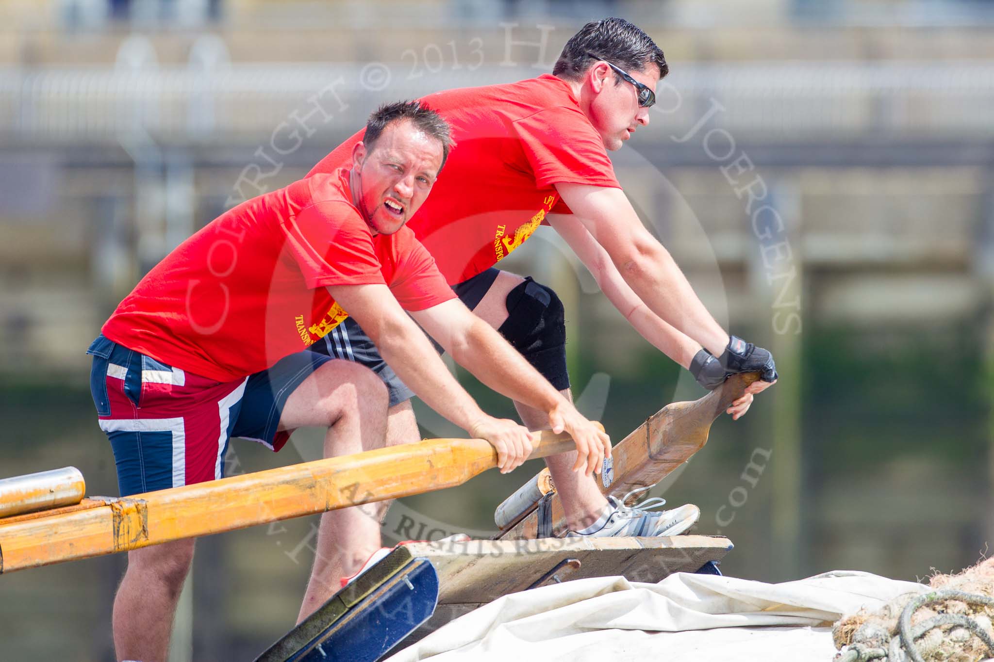 TOW River Thames Barge Driving Race 2013: Rowers on barge "Diana", by Trinity Buoy Wharf.. River Thames between Greenwich and Westminster, London, United Kingdom, on 13 July 2013 at 13:08, image #278