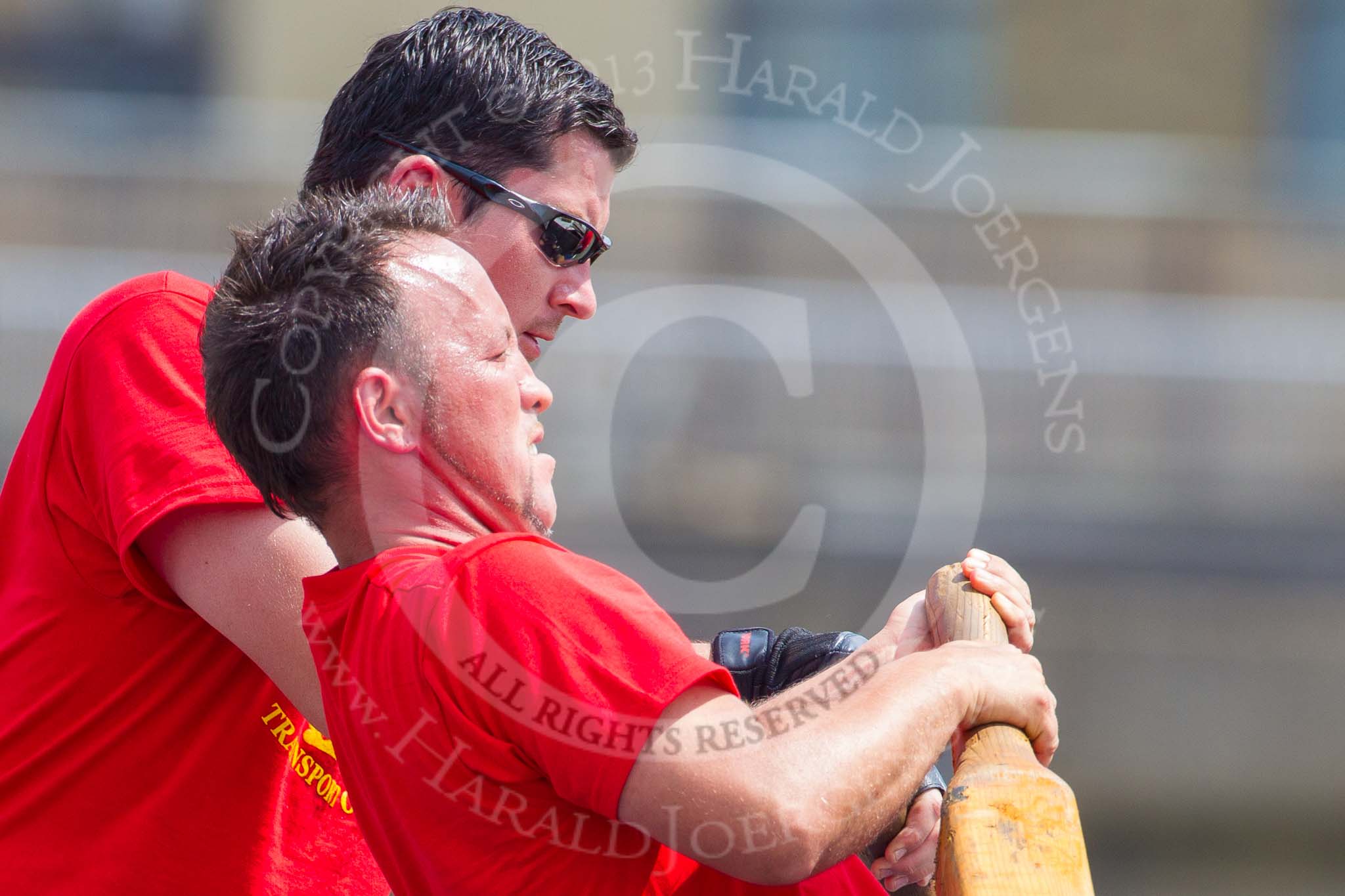 TOW River Thames Barge Driving Race 2013: Rowers on barge "Diana", by Trinity Buoy Wharf.. River Thames between Greenwich and Westminster, London, United Kingdom, on 13 July 2013 at 13:09, image #282