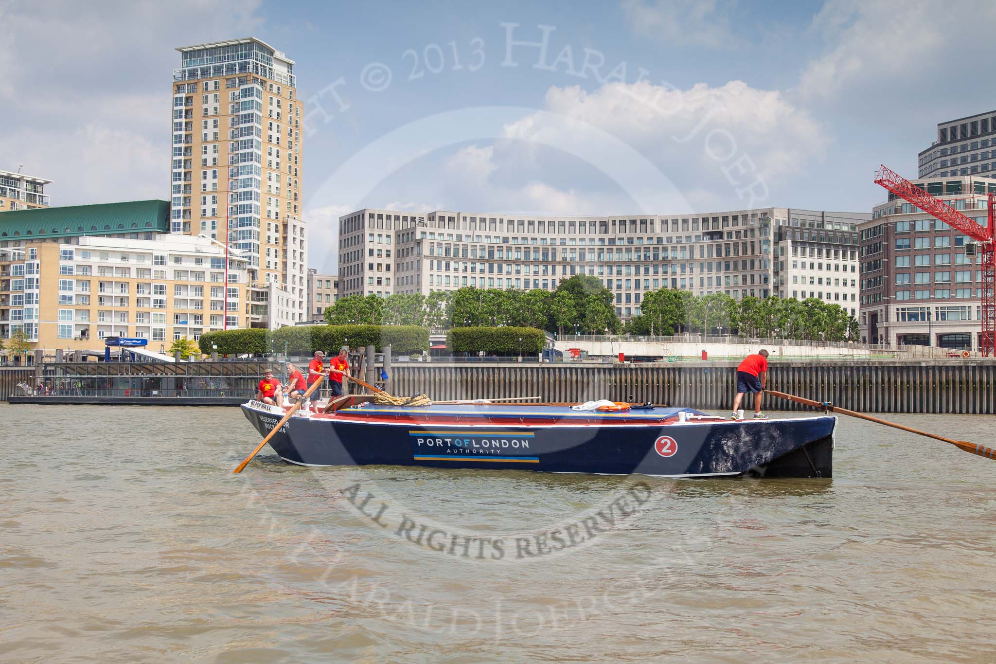 TOW River Thames Barge Driving Race 2013: Barge "Blackwall", by the Port of London Authority, in front of Canary Wharf Pier.. River Thames between Greenwich and Westminster, London, United Kingdom, on 13 July 2013 at 13:10, image #283