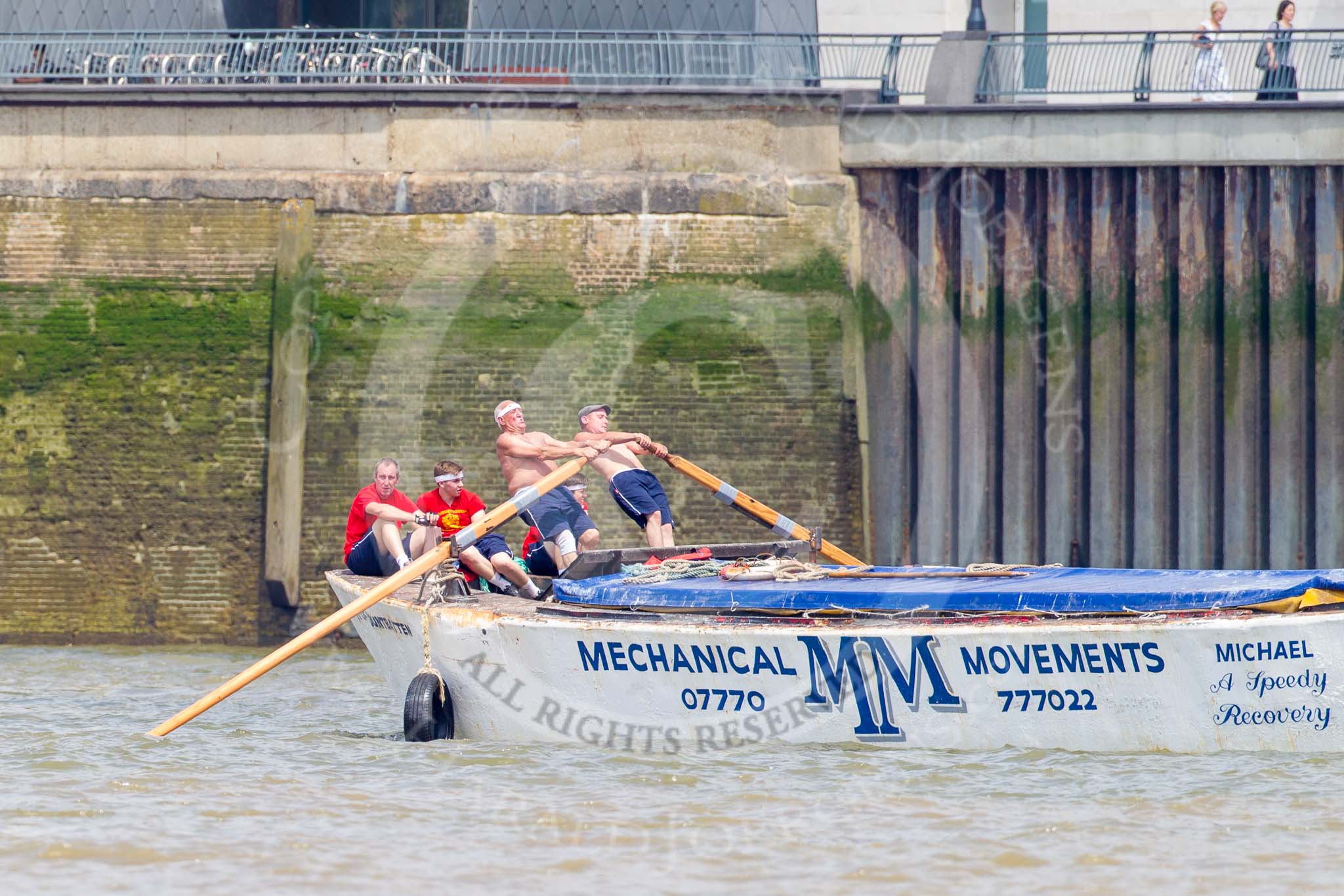 TOW River Thames Barge Driving Race 2013: Rowers at the bow of barge "Darren Lacey", by Princess Pocahontas, during the race.. River Thames between Greenwich and Westminster, London, United Kingdom, on 13 July 2013 at 13:13, image #289