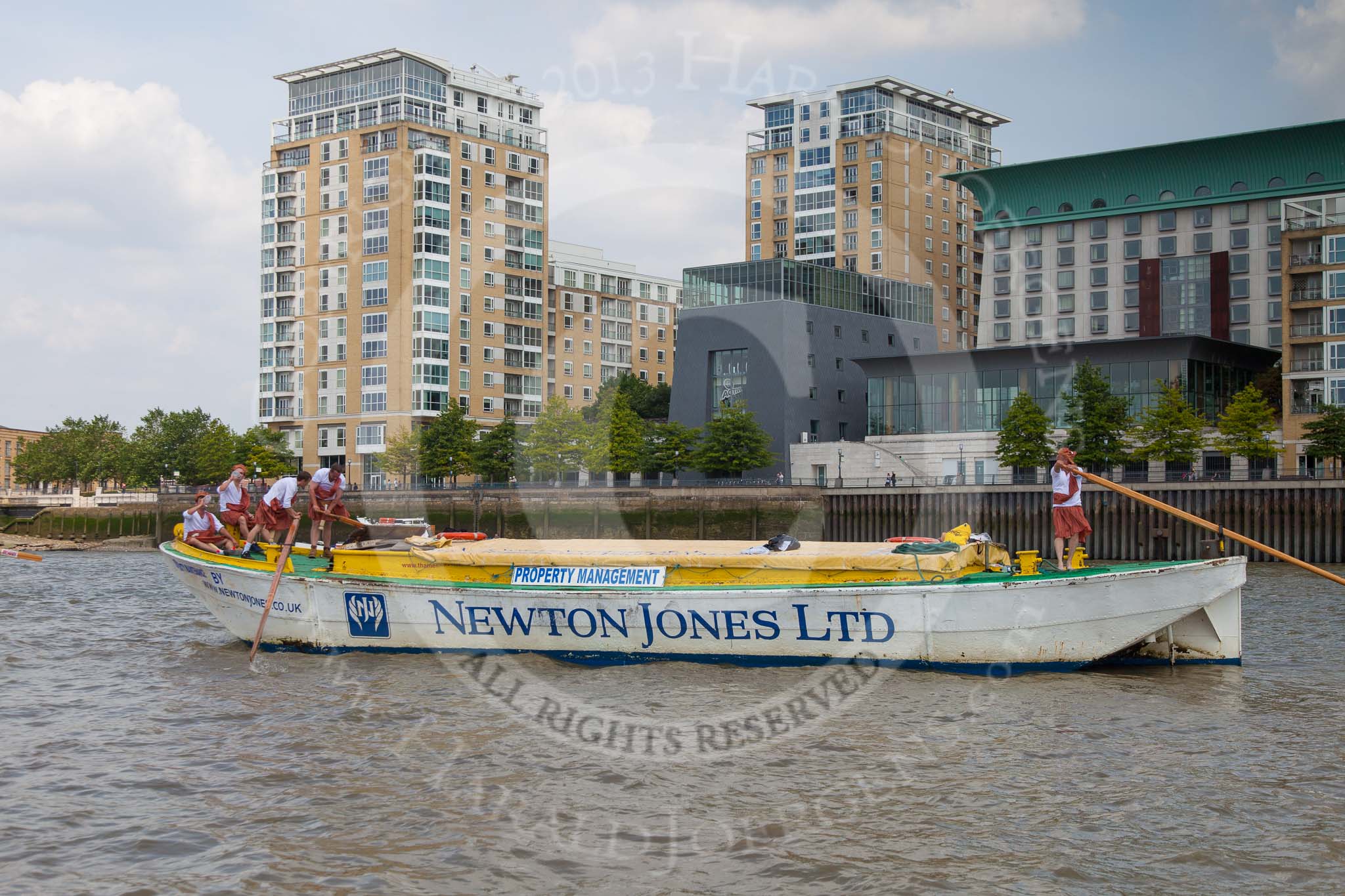 TOW River Thames Barge Driving Race 2013: Barge "Darren Lacey", by Princess Pocahontas, in front of Canary Wharf.. River Thames between Greenwich and Westminster, London, United Kingdom, on 13 July 2013 at 13:14, image #296