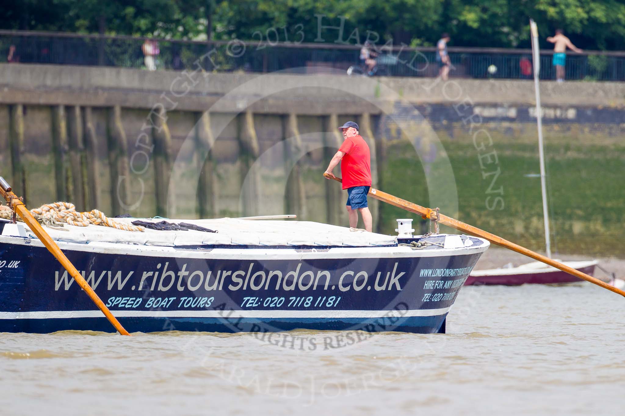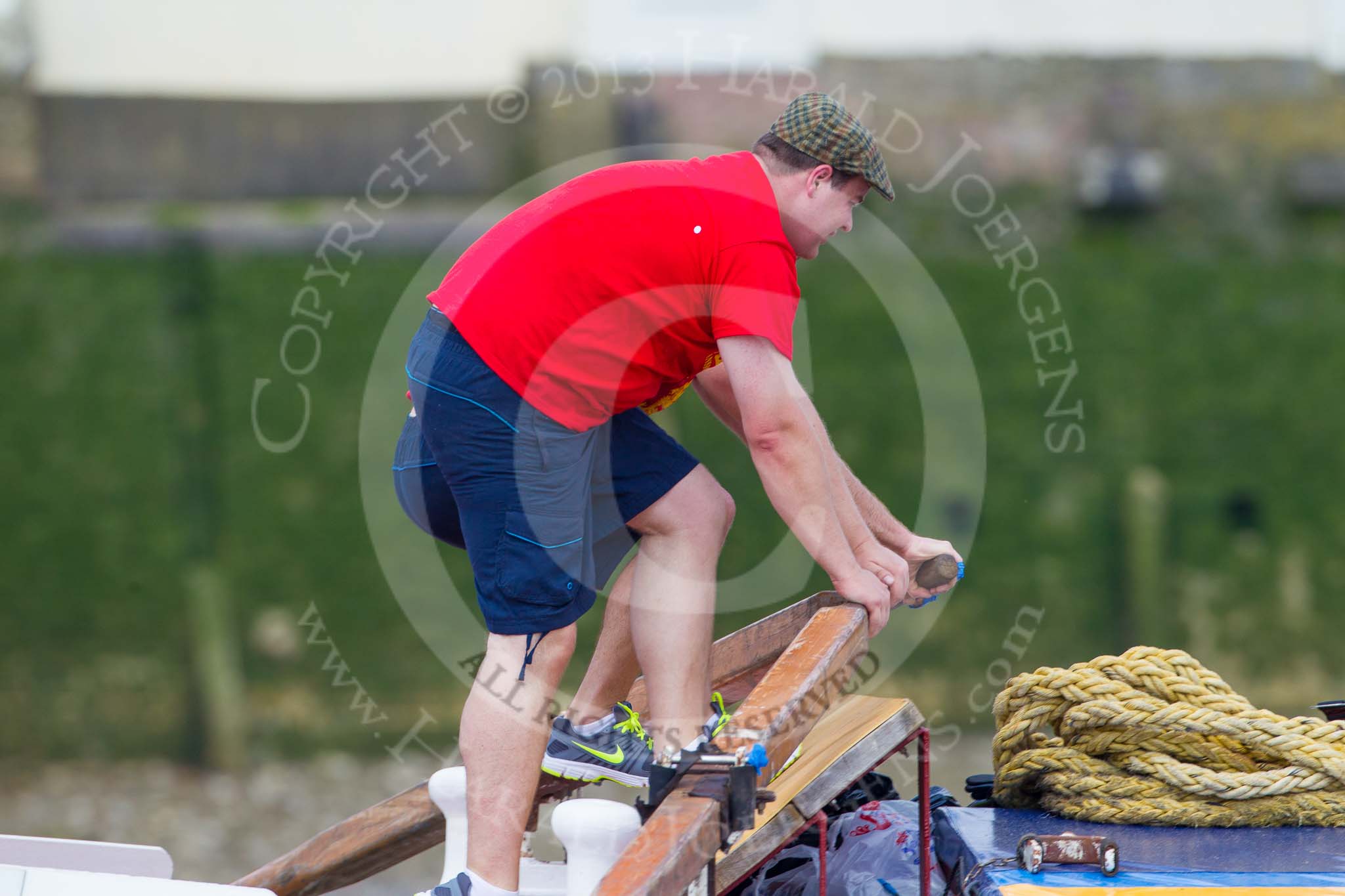 TOW River Thames Barge Driving Race 2013: The steerer on board of barge "Blackwall", by the Port of London Authority.. River Thames between Greenwich and Westminster, London, United Kingdom, on 13 July 2013 at 13:32, image #355