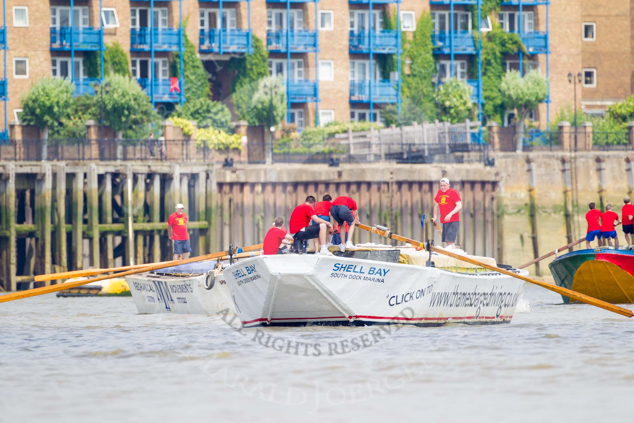 TOW River Thames Barge Driving Race 2013: Barge barge "Shell Bay", by South Dock Marina, followed by barge "Spirit of Mountabatten", by Mechanical Movements and Enabling Services Ltd, on the left, and barge "Jane", by the RMT Union, on the right.. River Thames between Greenwich and Westminster, London, United Kingdom, on 13 July 2013 at 13:27, image #350