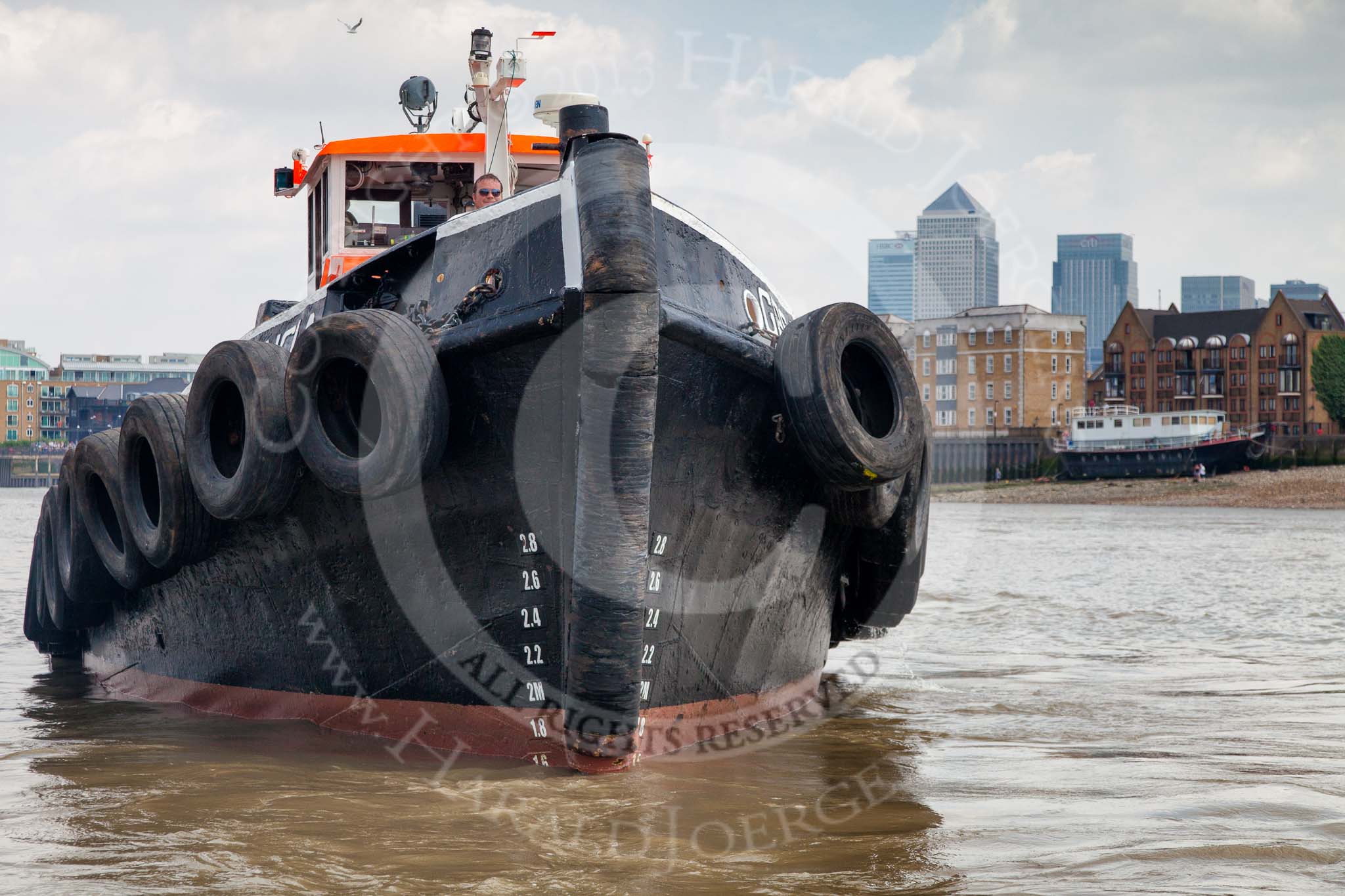 TOW River Thames Barge Driving Race 2013: The bow of GPS Marine tug "GPS Vincia" at close distance. In the background the skyscrapers of Canary Wharf.. River Thames between Greenwich and Westminster, London, United Kingdom, on 13 July 2013 at 13:30, image #351