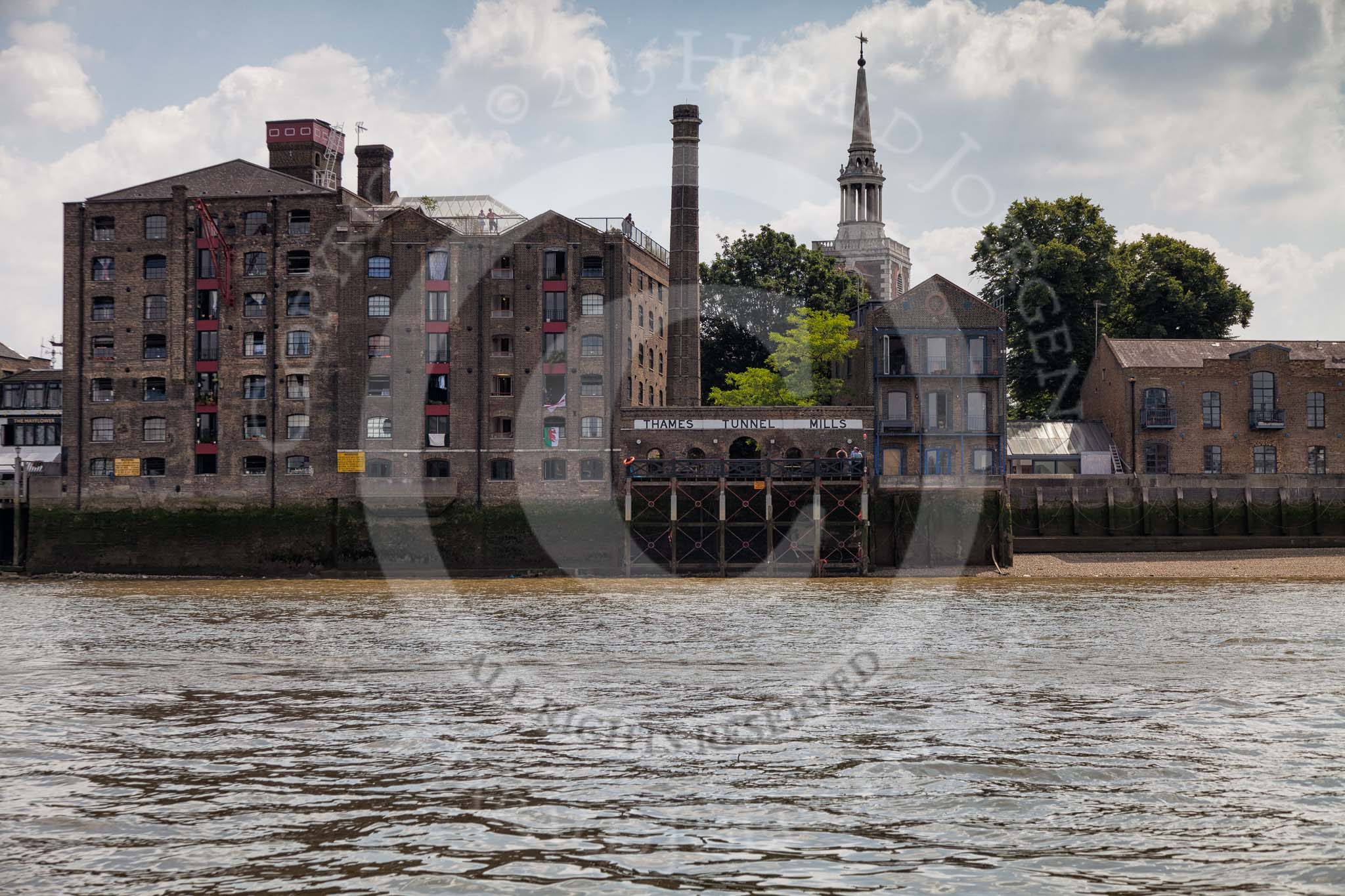 TOW River Thames Barge Driving Race 2013: Thames Tunnel Mill, a former warehouse converted to a residential building. In the background the spire od St Mary the Virgin.. River Thames between Greenwich and Westminster, London, United Kingdom, on 13 July 2013 at 13:30, image #352