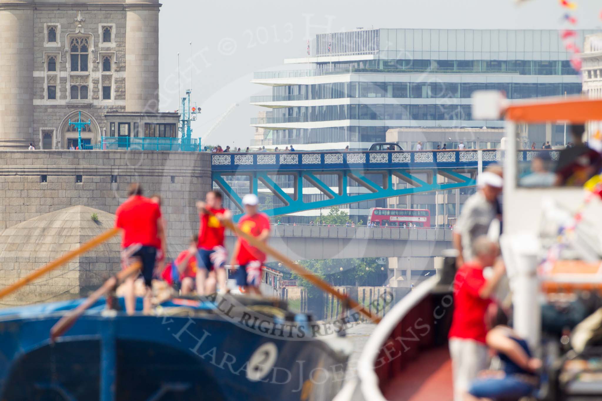 TOW River Thames Barge Driving Race 2013: Tower Bridge seem from behind barge "Diana", by Trinity Buoy Wharf.. River Thames between Greenwich and Westminster, London, United Kingdom, on 13 July 2013 at 13:33, image #358