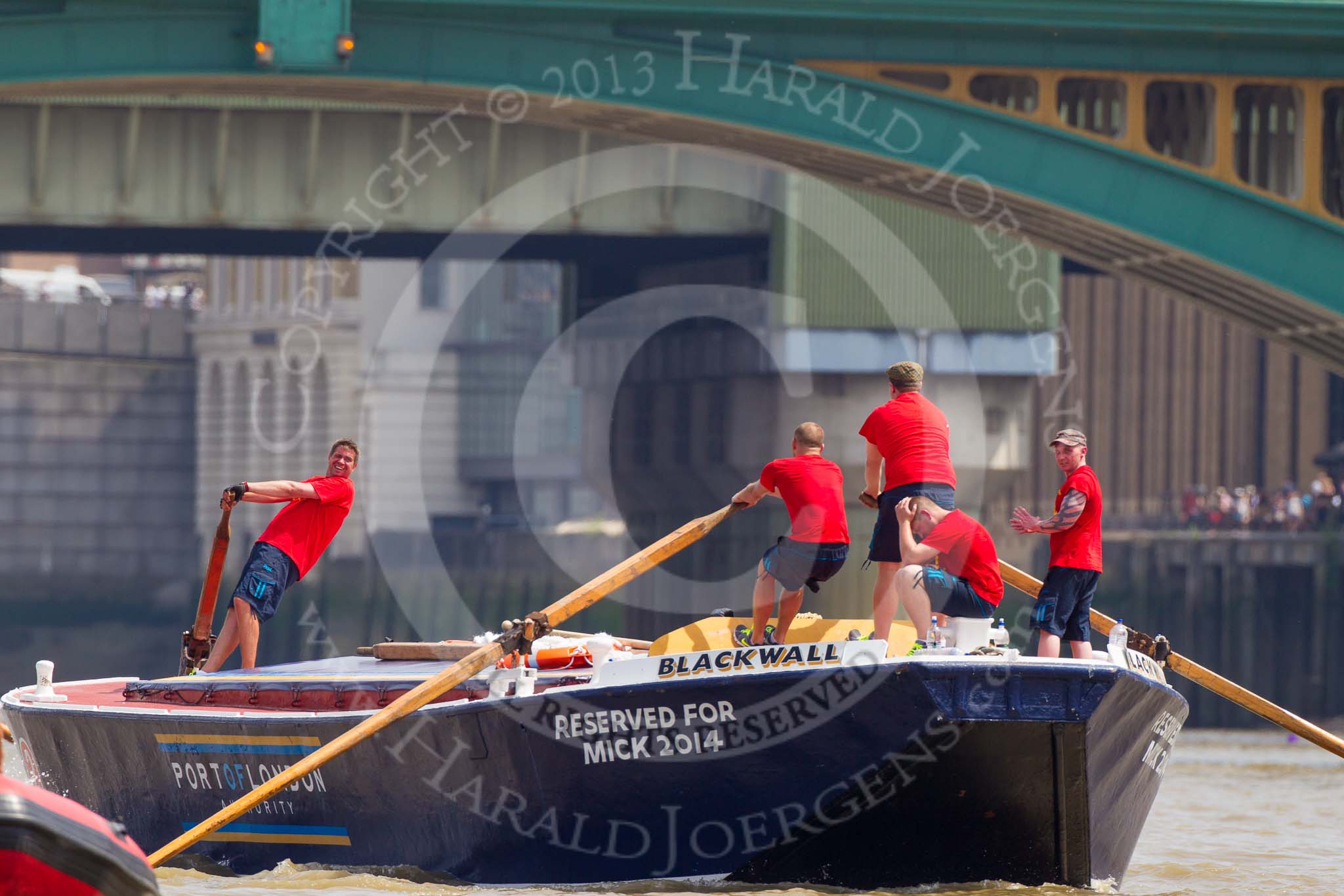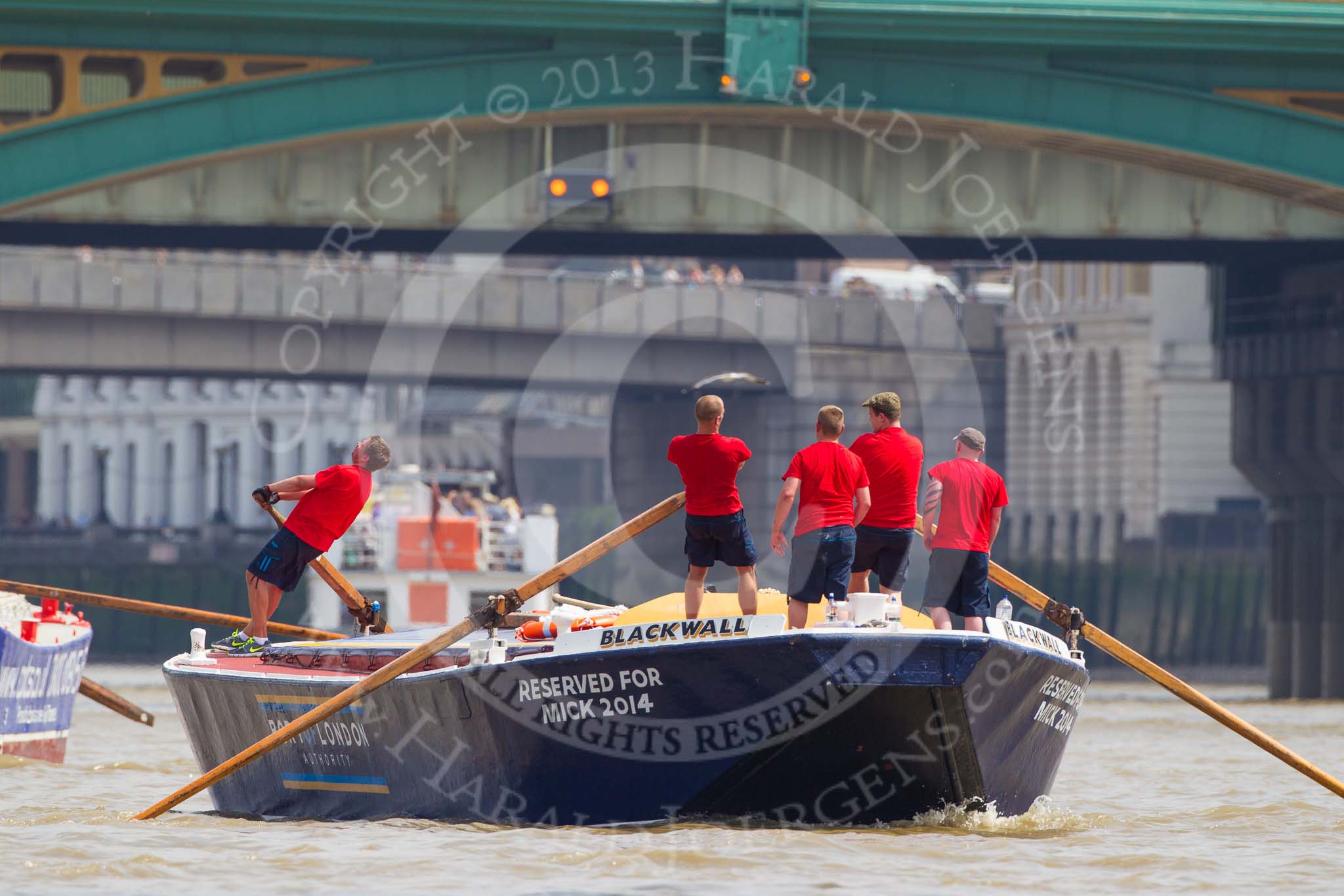 TOW River Thames Barge Driving Race 2013: Barge "Blackwall", by the Port of London Authority, passing Cannon Street Railway Bridge and Southwark Bridge.. River Thames between Greenwich and Westminster, London, United Kingdom, on 13 July 2013 at 13:56, image #407