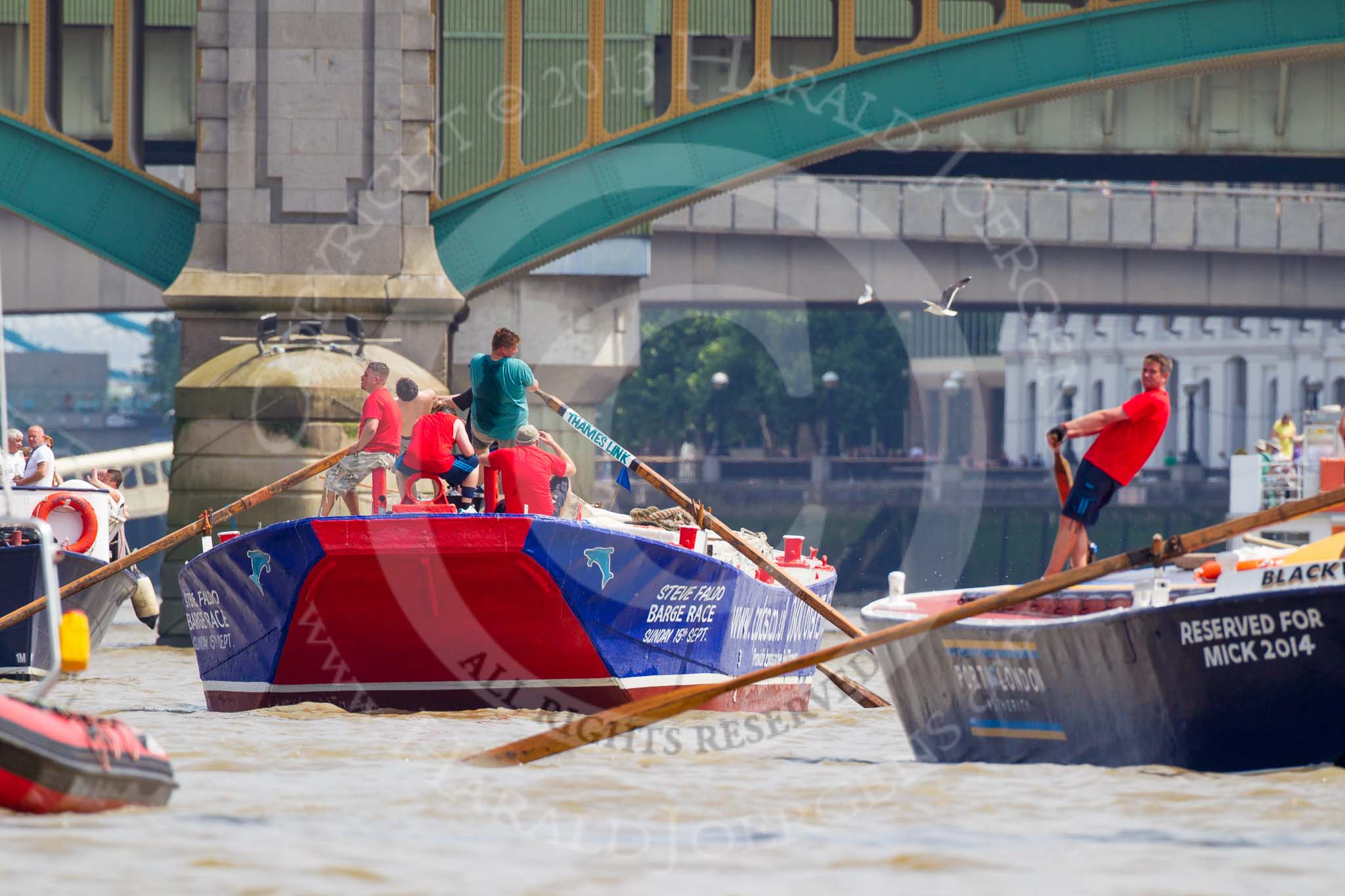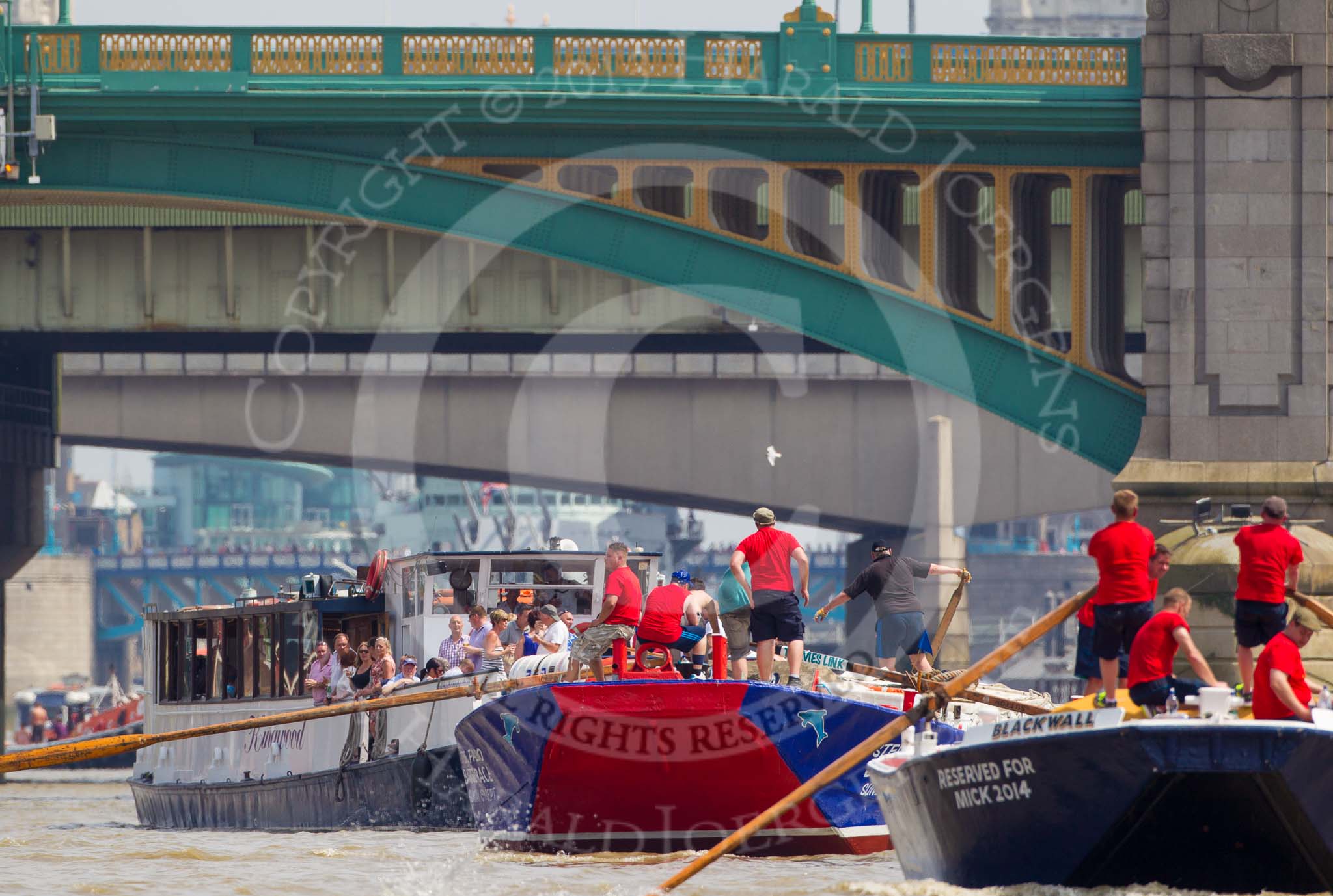 TOW River Thames Barge Driving Race 2013: Barges approaching from Southwark Bridge, from left barge "Diana", by Trinity Buoy Wharf, barge "Blackwall", by the Port of London Authority, and barge "Steve Faldo" by Capital Pleasure Boats.. River Thames between Greenwich and Westminster, London, United Kingdom, on 13 July 2013 at 13:56, image #406