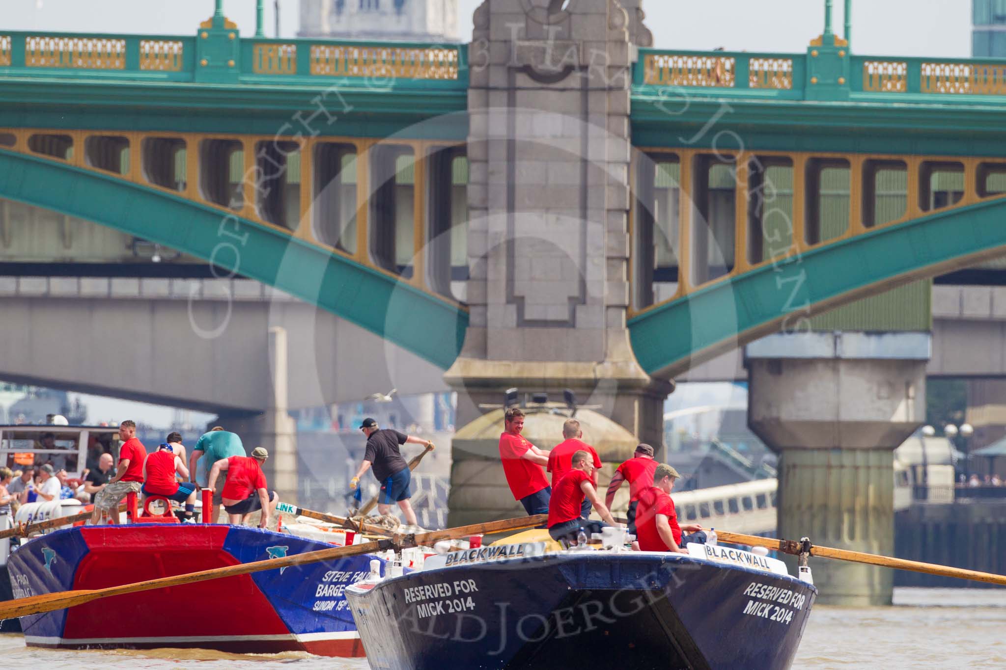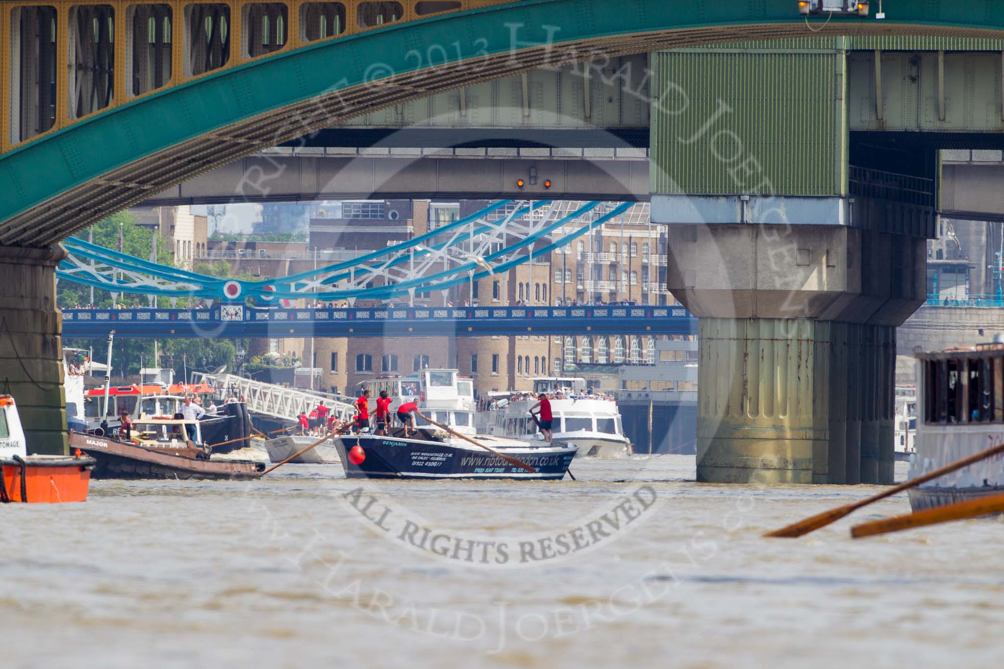 TOW River Thames Barge Driving Race 2013: Barge "Benjamin", by London Party Boats, followed by barge "Shell Bay" by South Dock Marina, passing London Bridge. In the foreground Cannon Street Railway Bridge and Southwark Bridge.. River Thames between Greenwich and Westminster, London, United Kingdom, on 13 July 2013 at 13:57, image #412