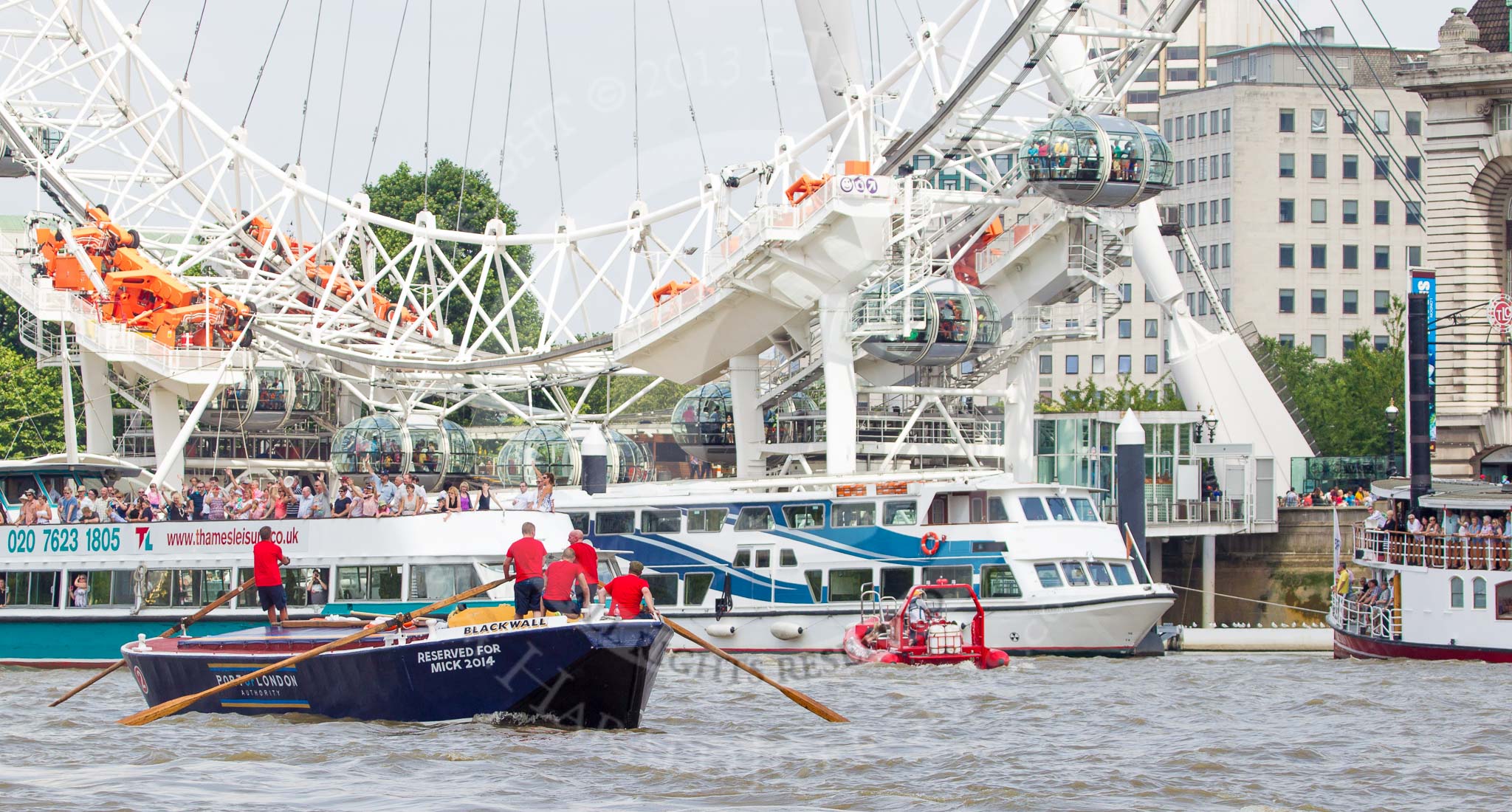 TOW River Thames Barge Driving Race 2013: Barge "Blackwall", by the Port of London Authority, at the London Eye, close to the finish of the race at Westminster Bridge.. River Thames between Greenwich and Westminster, London, United Kingdom, on 13 July 2013 at 14:16, image #417
