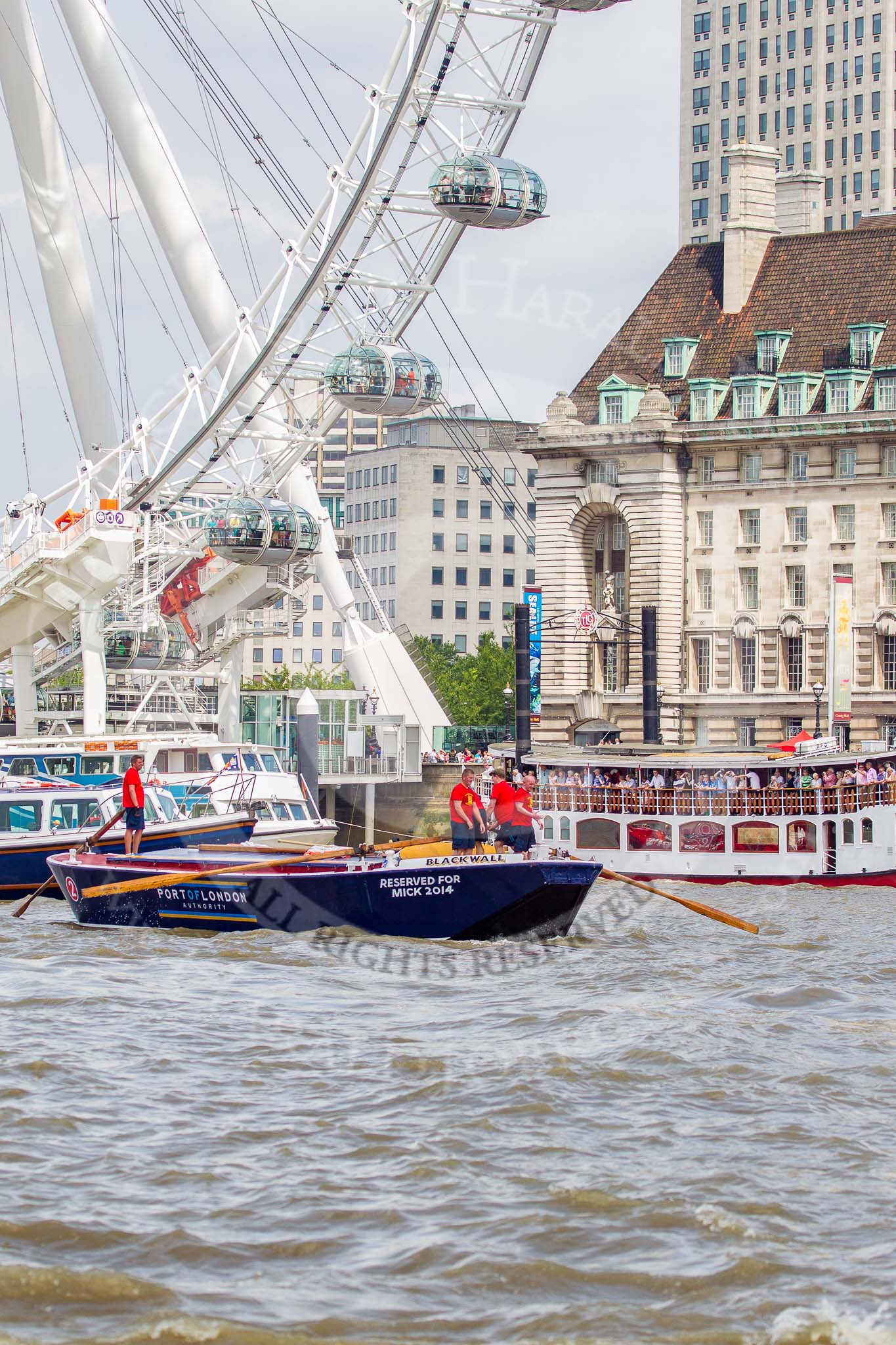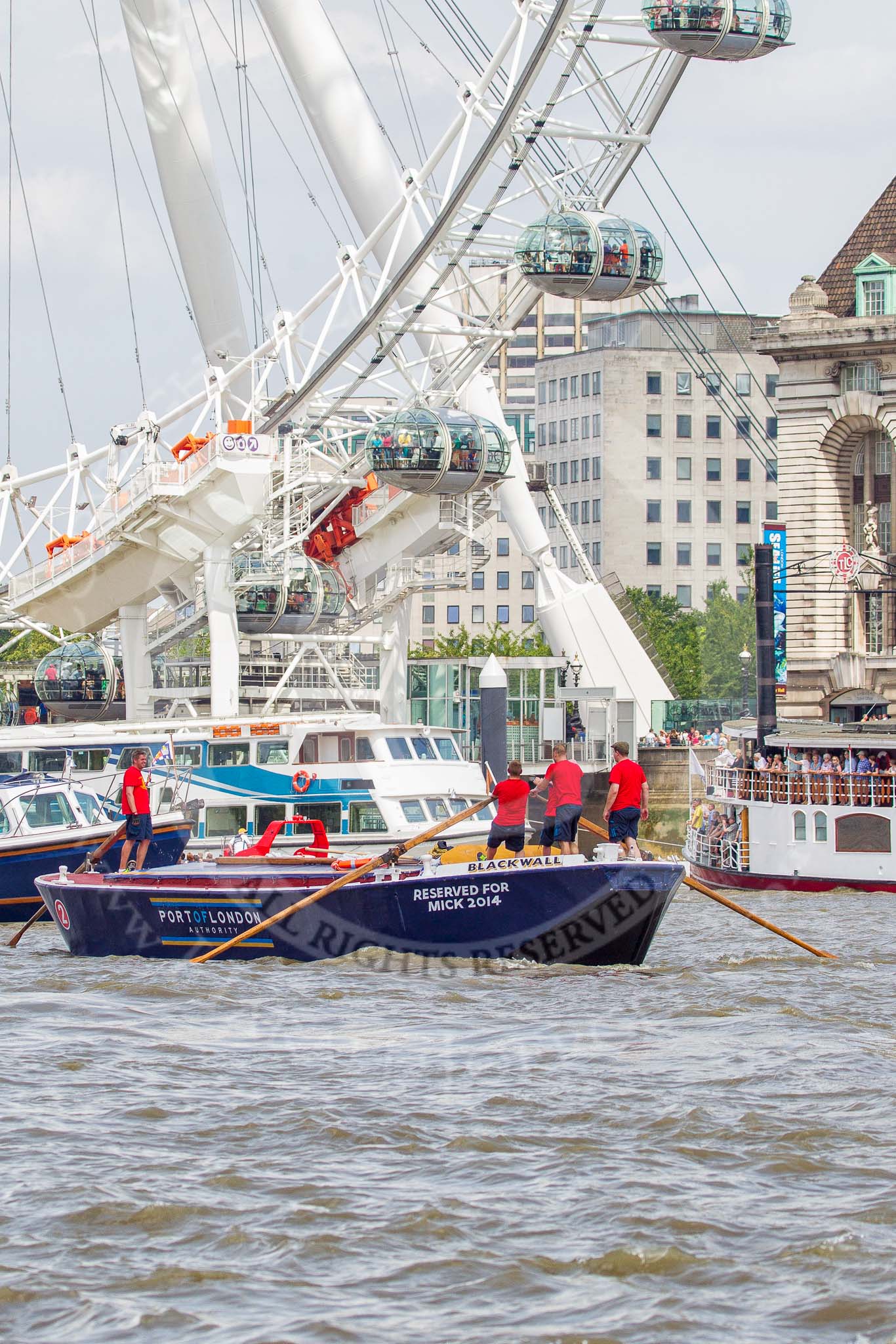 TOW River Thames Barge Driving Race 2013: Barge "Blackwall", by the Port of London Authority, at the London Eye, close to the finish of the race at Westminster Bridge.. River Thames between Greenwich and Westminster, London, United Kingdom, on 13 July 2013 at 14:16, image #415