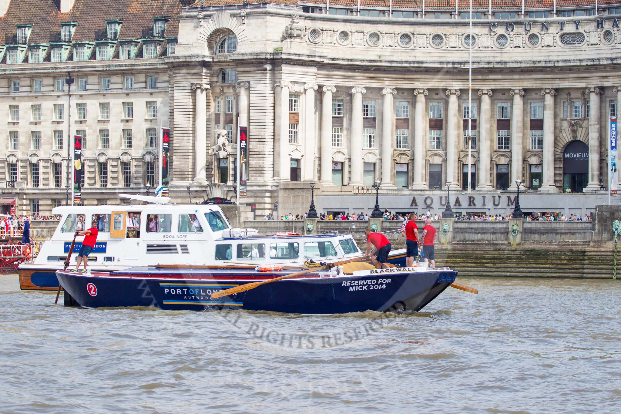 TOW River Thames Barge Driving Race 2013: Barge "Blackwall", by the Port of London Authority, at the London Aquarium, close to the finish of the race at Westminster Bridge.. River Thames between Greenwich and Westminster, London, United Kingdom, on 13 July 2013 at 14:16, image #419