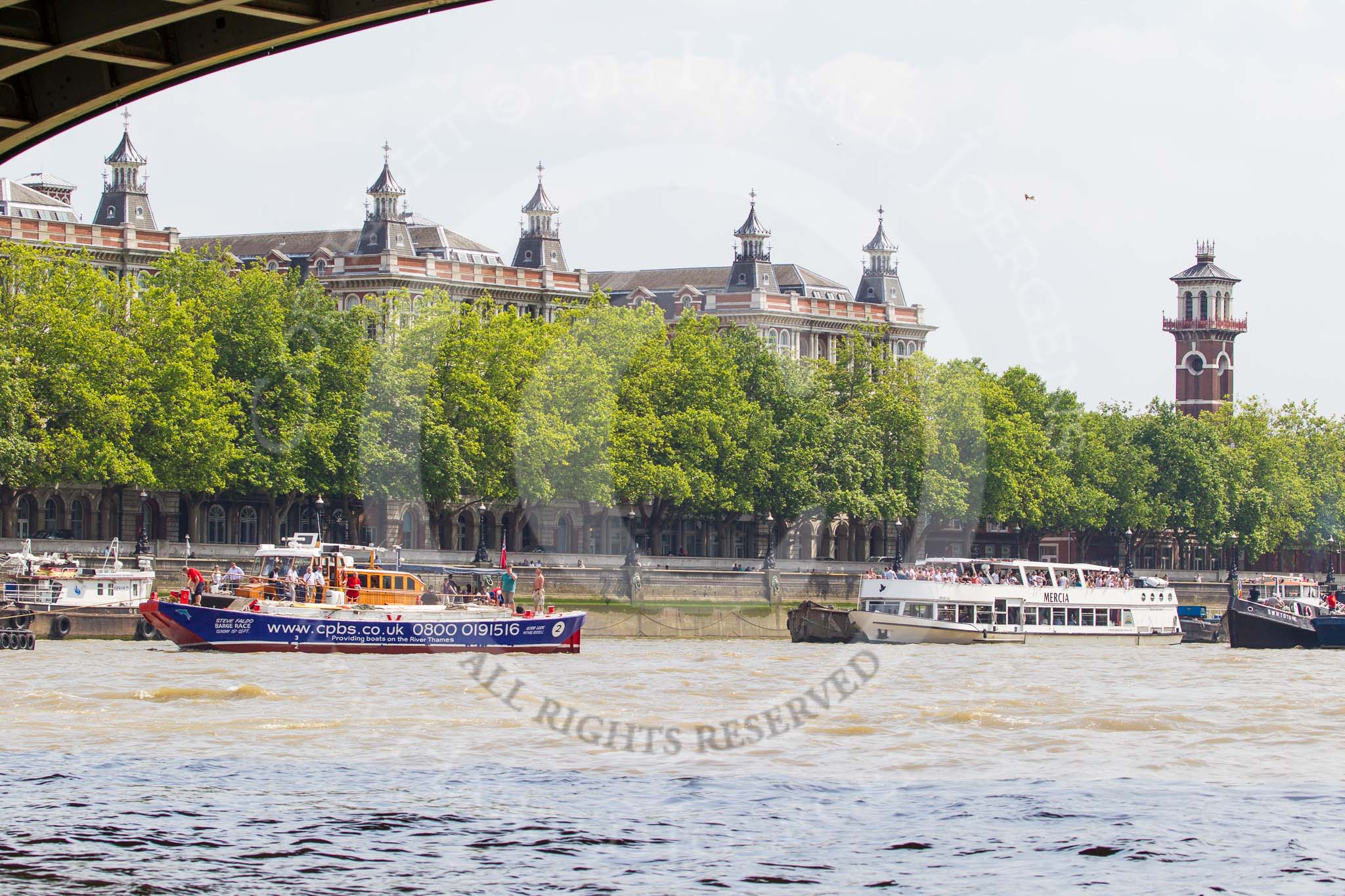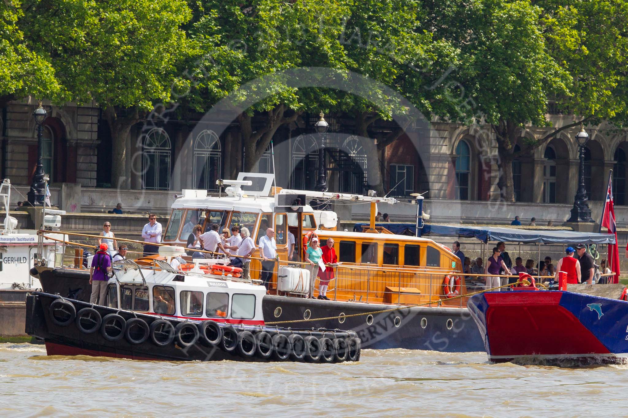 TOW River Thames Barge Driving Race 2013: Barge "Steve Faldo" by Capital Pleasure Boats, behind the finish line at Westminster Bridge, ready to be towed back to Greenwich by tug "Bulldog". Behind them is MV Havengore, hosting VIP guests.. River Thames between Greenwich and Westminster, London, United Kingdom, on 13 July 2013 at 14:33, image #483
