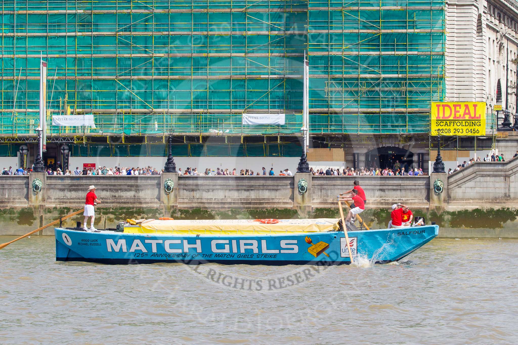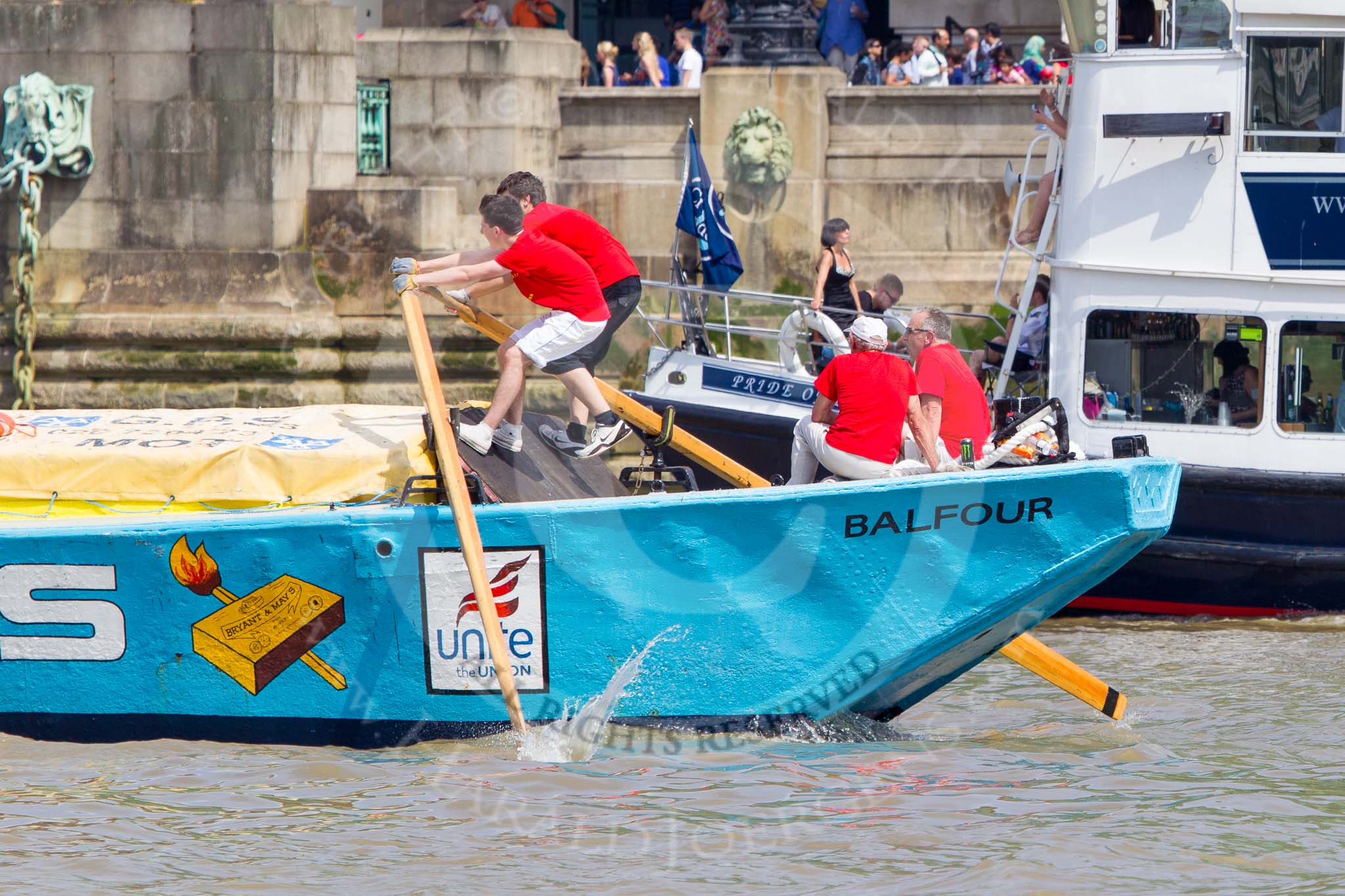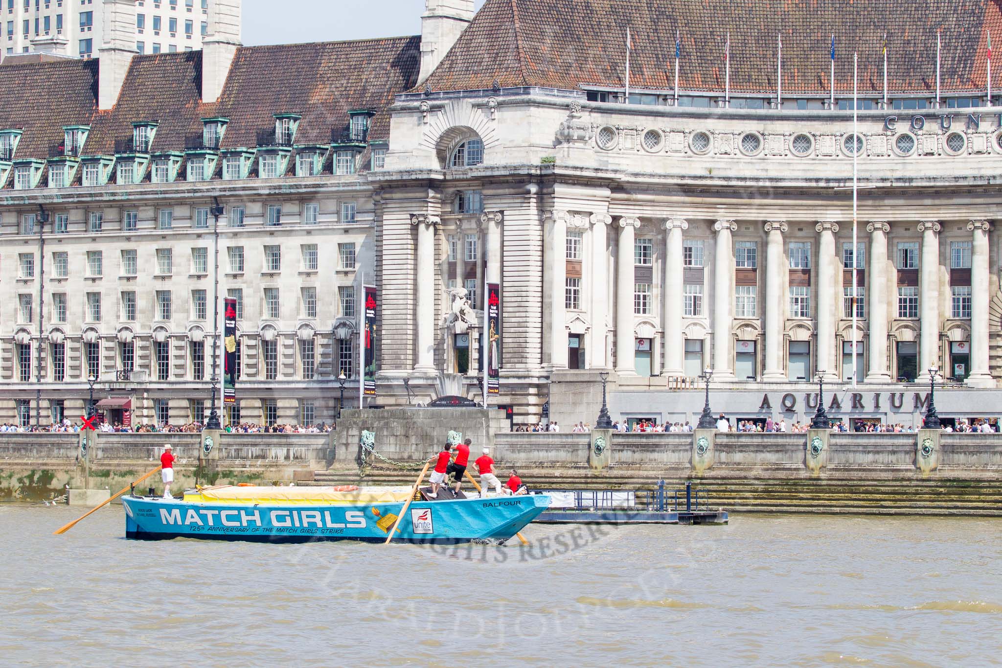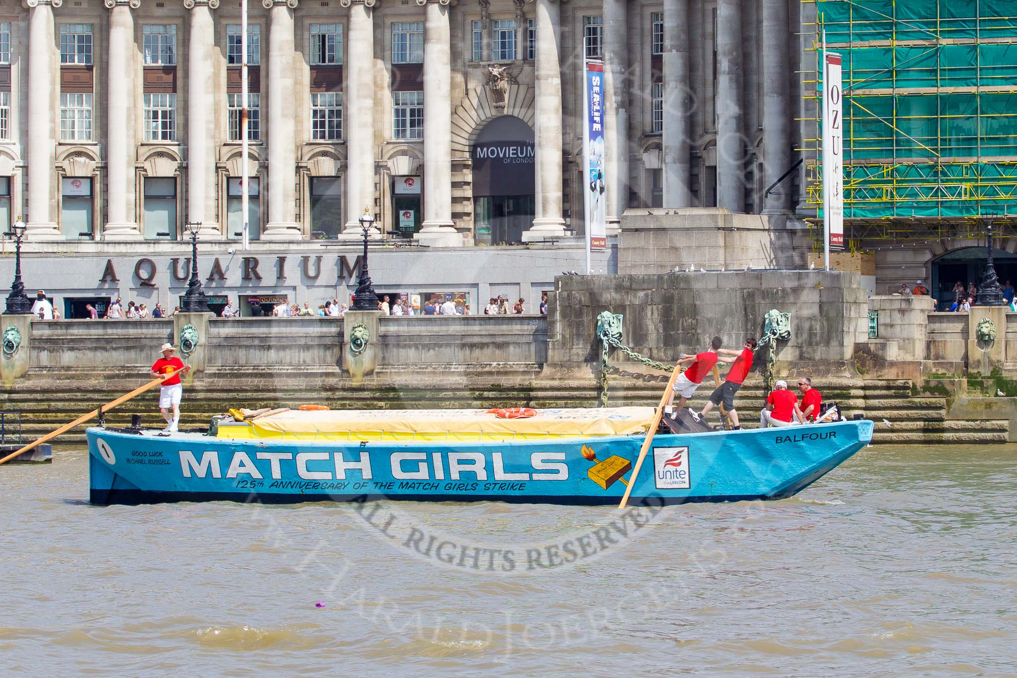 TOW River Thames Barge Driving Race 2013: Barge "The Matchgirls", by Unite the Union, at the London Aquarium, at the race finish at Westminster Bridge.. River Thames between Greenwich and Westminster, London, United Kingdom, on 13 July 2013 at 14:36, image #495