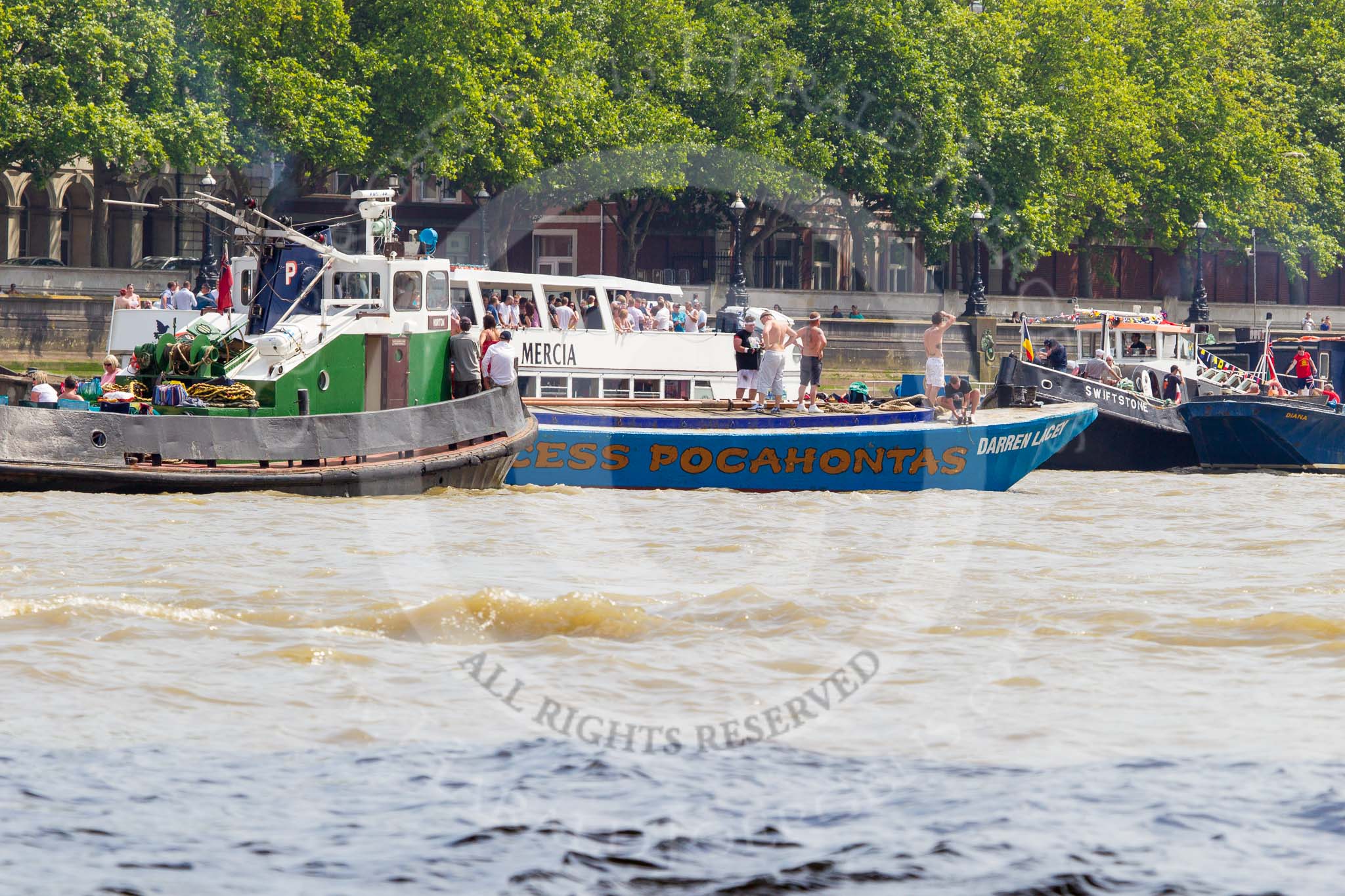 TOW River Thames Barge Driving Race 2013: Barge "Darren Lacey", by Princess Pocahontas, after passing the race finish at Westminster Bridge.. River Thames between Greenwich and Westminster, London, United Kingdom, on 13 July 2013 at 14:31, image #481