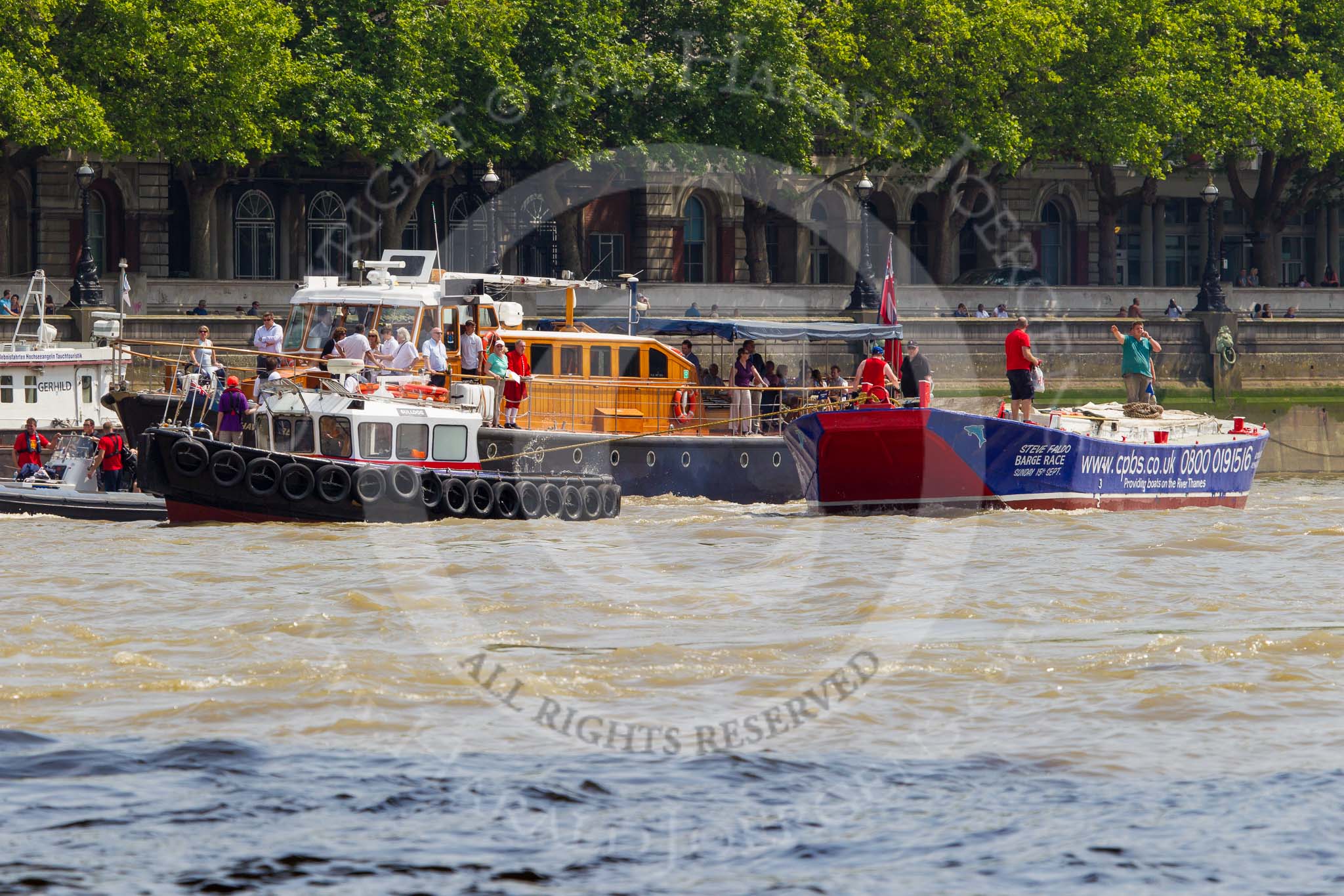 TOW River Thames Barge Driving Race 2013: GPS Marine tug "GPS India", barge "Hoppy", by GPS Fabrication, and barge "Benjamin", by London Party Boats, behind the fiish line of the race at Westminster Bridge.. River Thames between Greenwich and Westminster, London, United Kingdom, on 13 July 2013 at 14:35, image #488