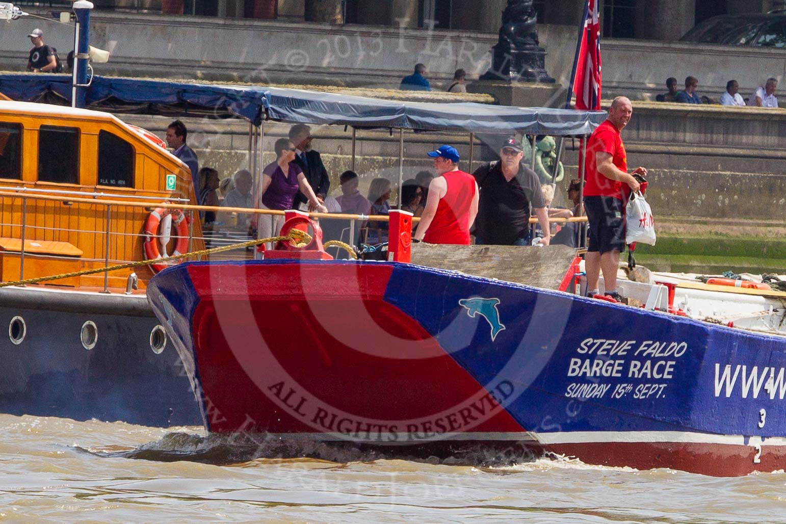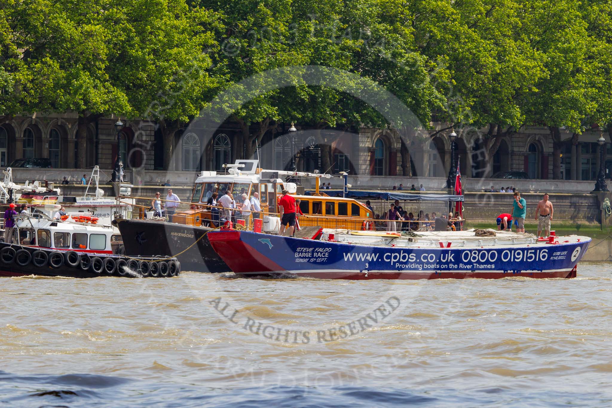 TOW River Thames Barge Driving Race 2013: Barge "Steve Faldo" by Capital Pleasure Boats, behind the finish line at Westminster Bridge, ready to be towed back to Greenwich by tug "Bulldog". Behind them is MV Havengore, hosting VIP guests.. River Thames between Greenwich and Westminster, London, United Kingdom, on 13 July 2013 at 14:33, image #485