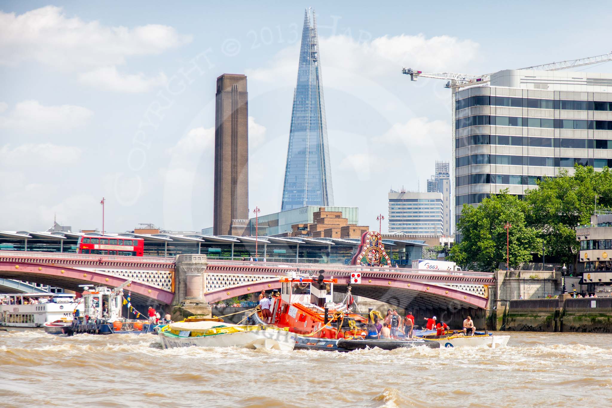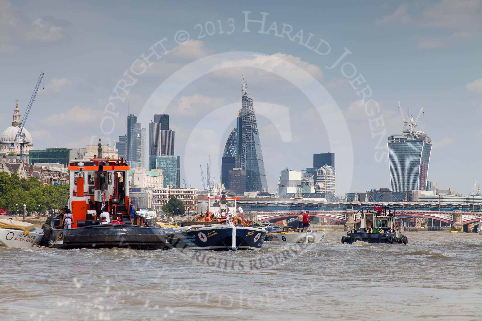 TOW River Thames Barge Driving Race 2013: Barges on the way back to Greenwich, passing Blackfriars Bridge, with the "Shard" building in the background.. River Thames between Greenwich and Westminster, London, United Kingdom, on 13 July 2013 at 14:51, image #536