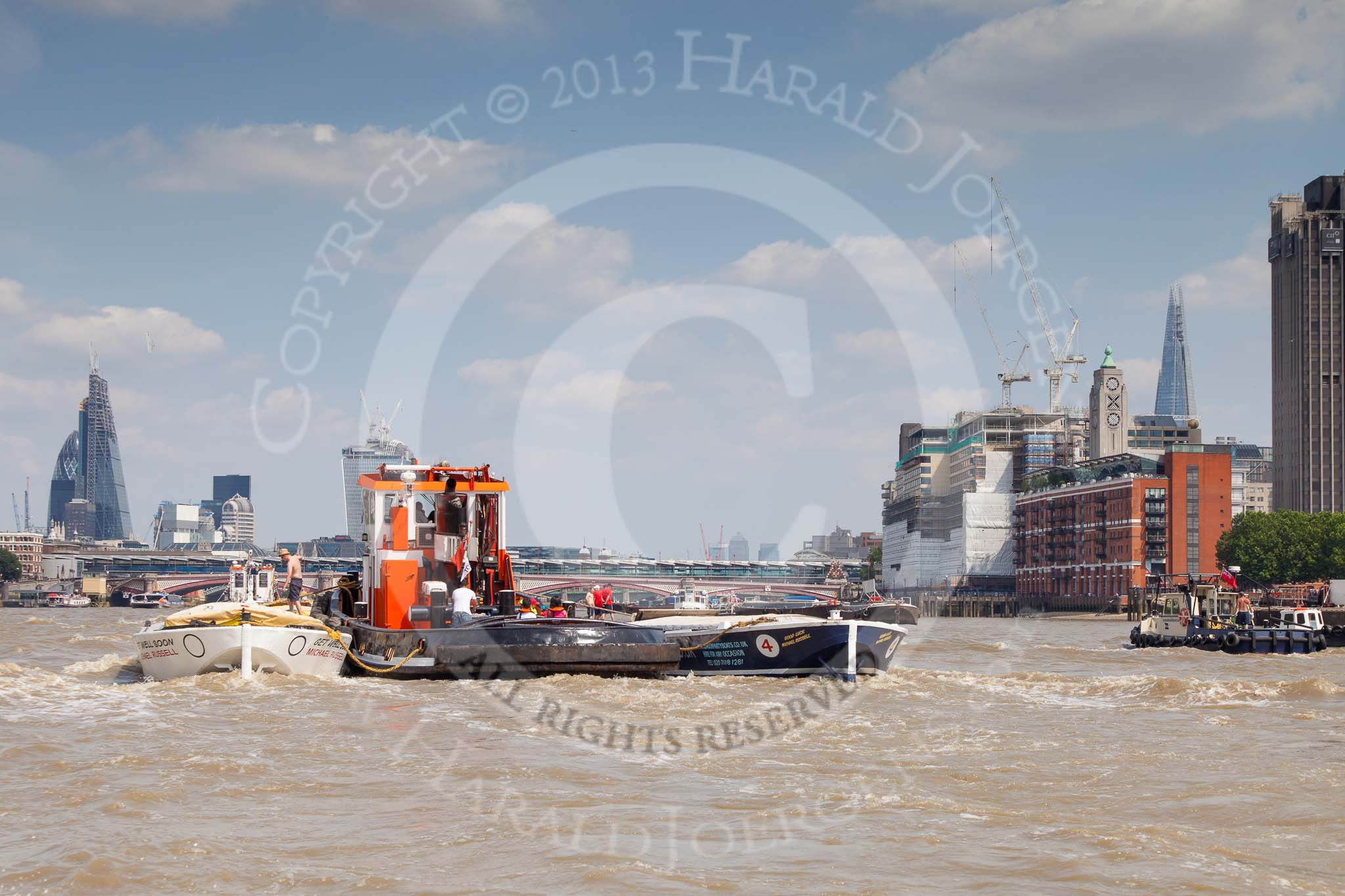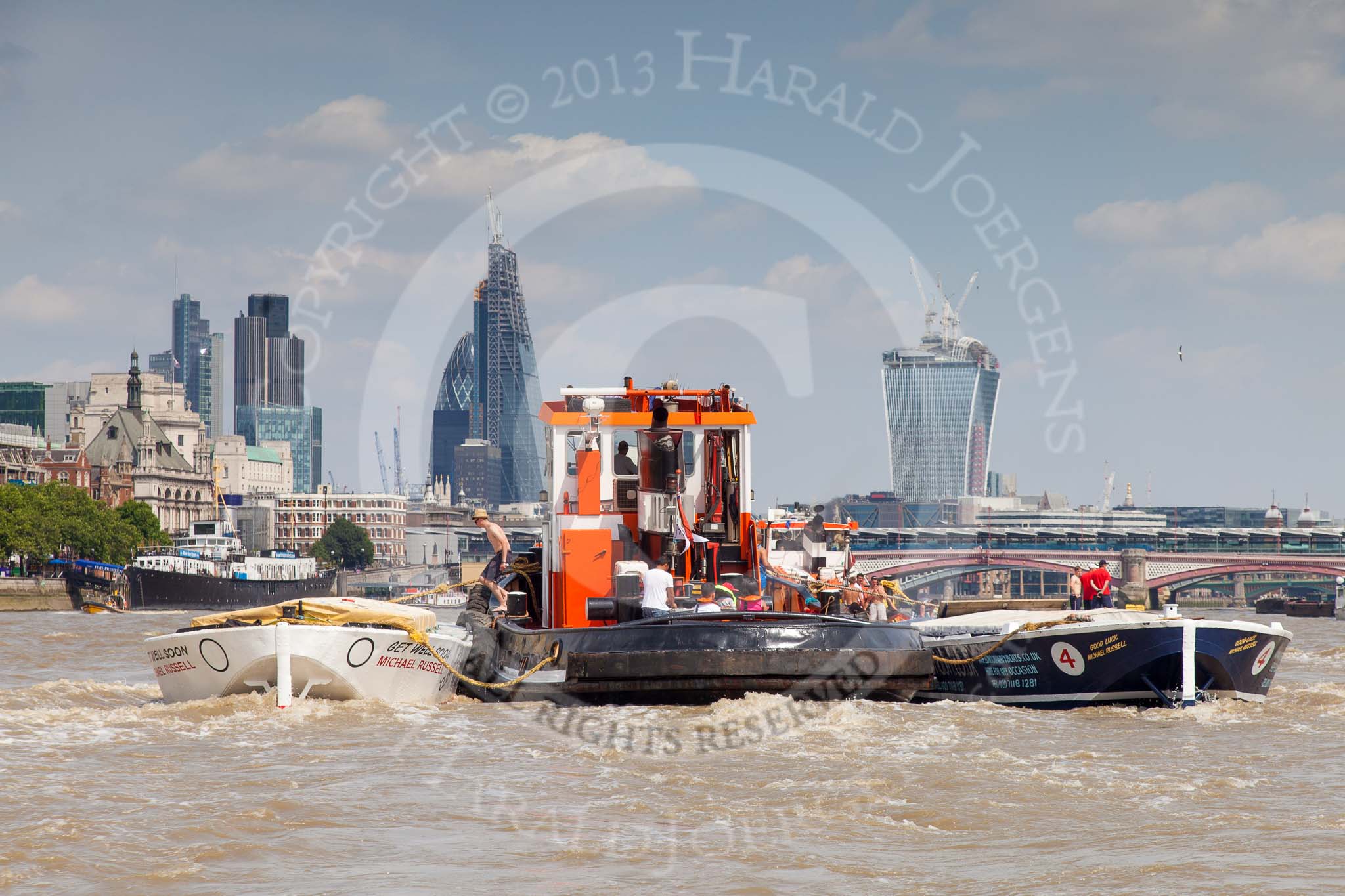 TOW River Thames Barge Driving Race 2013: GPS Marine tug "GPS India", pulling barge "Benjamin", by London Party Boats, and barge "Shell Bay" by South Dock Marina, back to Greenwich. In the background the London skyscapers, the "Gherkin", the "Cheesegrater", and the "Walkie Talkie".. River Thames between Greenwich and Westminster, London, United Kingdom, on 13 July 2013 at 14:48, image #529