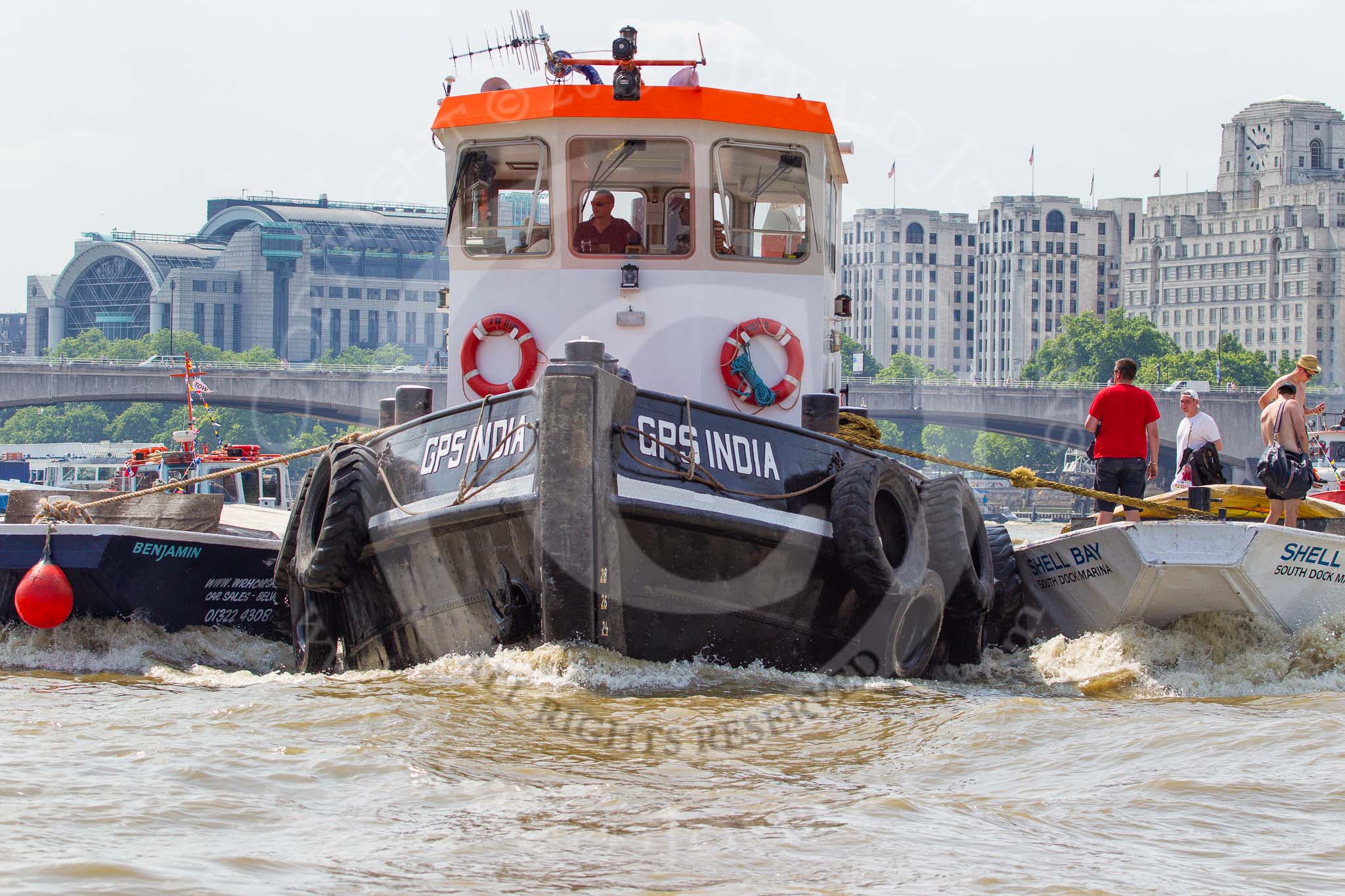 TOW River Thames Barge Driving Race 2013: GPS Marine tug "GPS India", pulling barge "Benjamin", by London Party Boats, and barge "Shell Bay" by South Dock Marina, back to Greenwich.. River Thames between Greenwich and Westminster, London, United Kingdom, on 13 July 2013 at 14:48, image #530