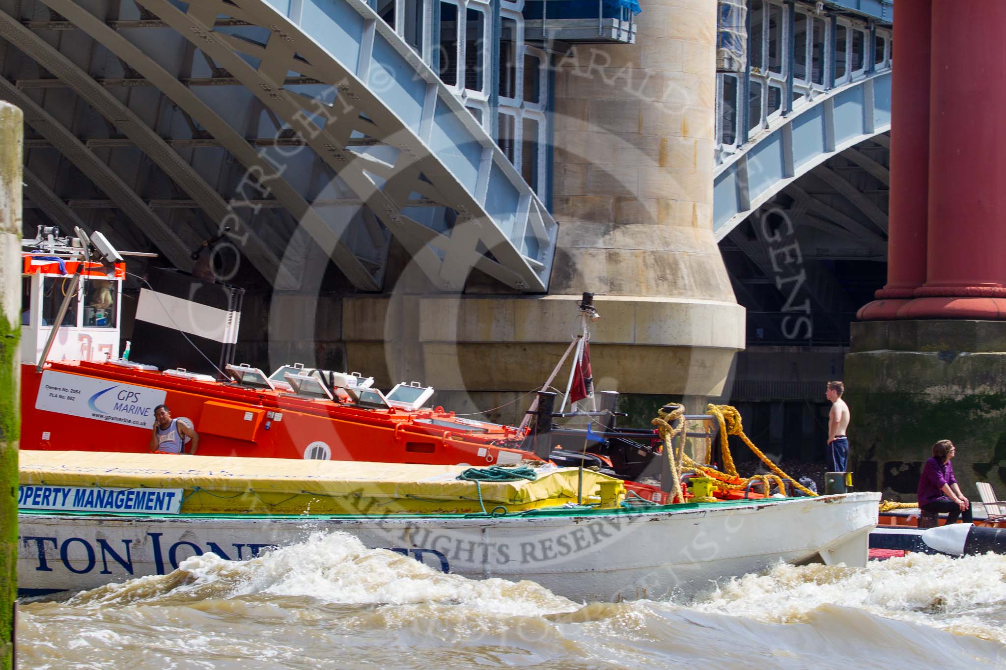 TOW River Thames Barge Driving Race 2013: GPS Marine tug "GPS Vincia" at Blackfriars Bridge, pulling barge "Hoppy", by GPS Fabrication, and barge barge "Spirit of Mountabatten", by Mechanical Movements and Enabling Services Ltd, back to Greenwich.. River Thames between Greenwich and Westminster, London, United Kingdom, on 13 July 2013 at 14:48, image #528