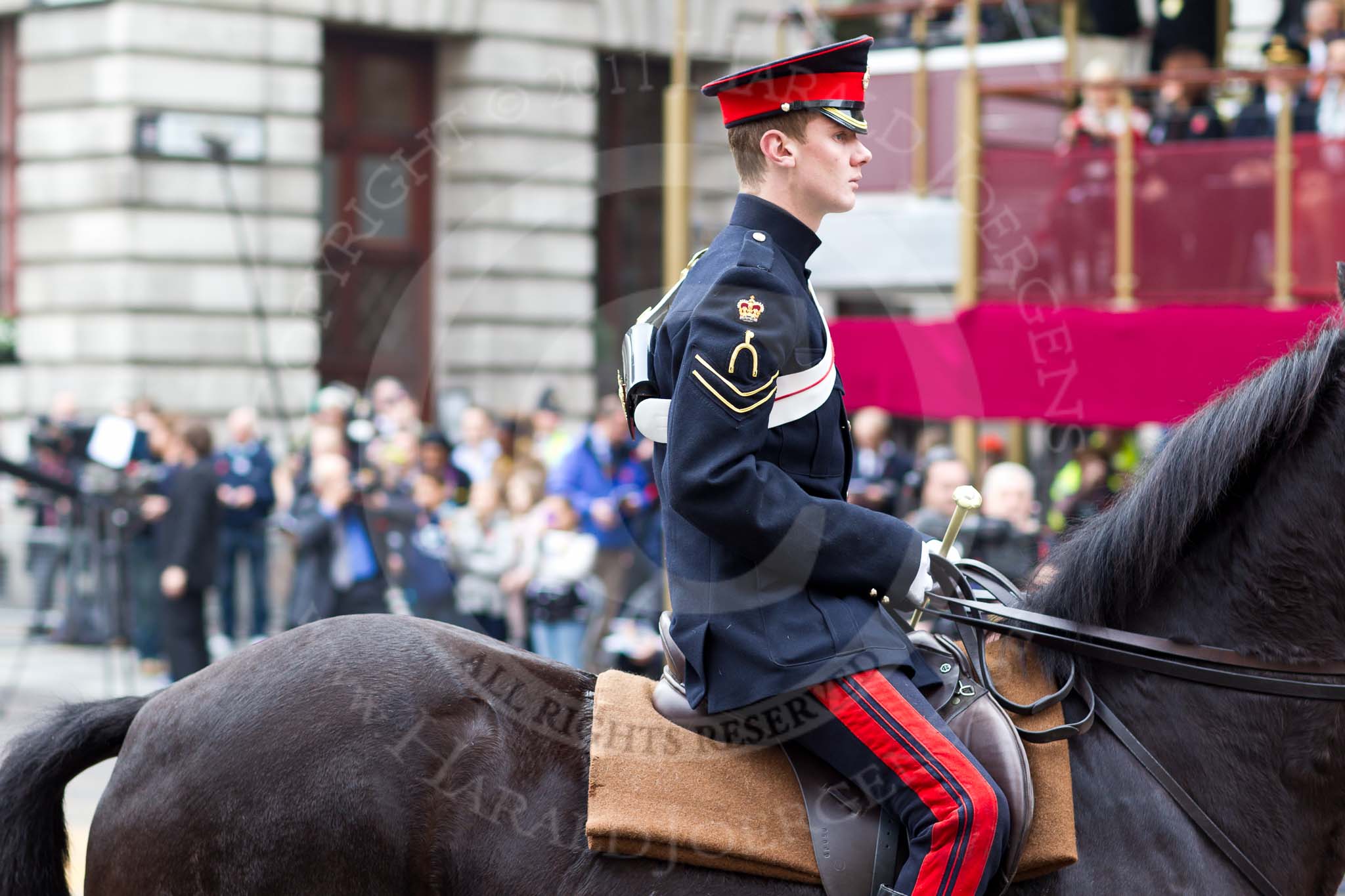 The Lord Mayor's Show 2011: Close-up of a Trooper from The Blues and Royals, Mounted Squadron, Household Regiment, the escort to the new Lord mayor.. Opposite Mansion House, City of London, London, -, United Kingdom, on 12 November 2011 at 10:50, image #30